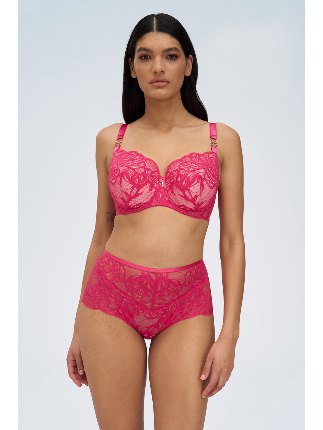 Яркий бюстгальтер Euphoric Rouge цвета фуксия на косточках, с боковой поддержкой, нижняя часть чашки на уплотнителе, верхняя из нежного кружева. Внутри чашечки проложены хлопковым трикотажем. Бретельки не отстегиваются, регулируются по длине. Между чашек красивое украшение в виде кристалла голубого цвета. На спинке застежка регулируется.