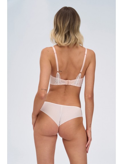 Роскошный бюстгальтер Fizzy Delight на косточках нежного бежевого цвета. Чашки на тонком поролоне с пуш-ап вкладышами. Внутренняя сторона чашки проложена хлопковым трикотажем, наружная покрыта красивым цветочным кружевом белого цвета, декорированным блеском. Бретельки регулируются по длине. На спине застежка на крючки-петли. Между чашек красивое украшение в виде кристалла. Чашки поддерживают и приподнимают бюст, сохраняя при этом его естественную форму.