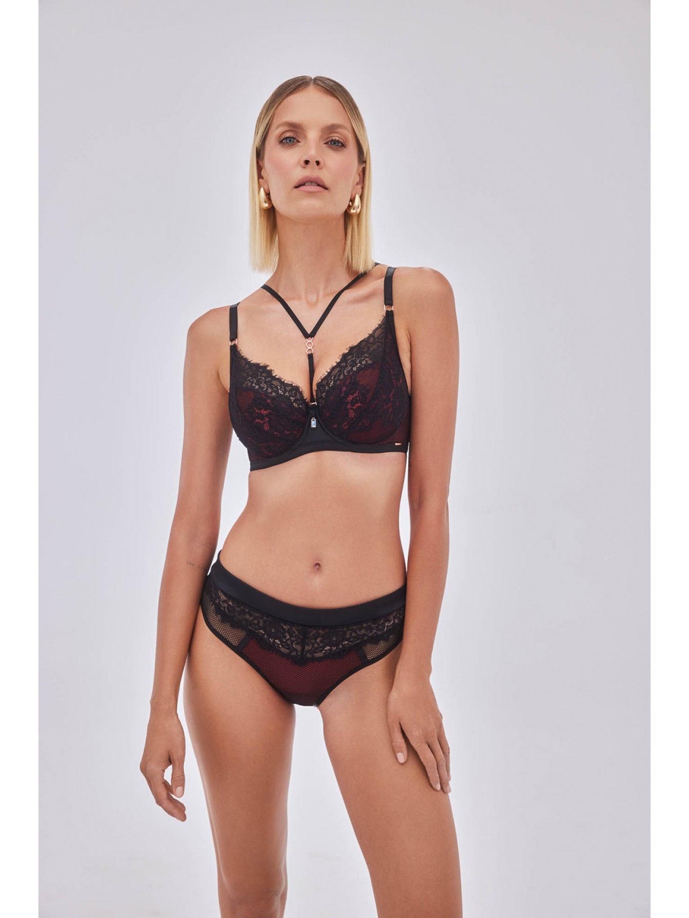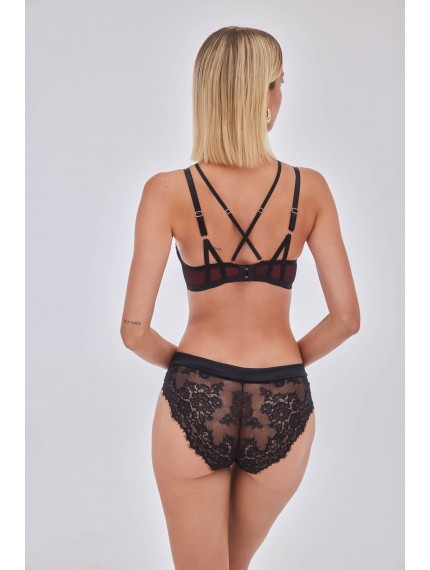 Роскошный бюстгальтер Heartbeat на косточках красного цвета с черной кружевной сеточкой. Чашки на тонком поролоне с пуш-ап вкладышами. Внутренняя сторона чашки проложена хлопковым трикотажем, наружная покрыта красивым кружевом. Бретельки регулируются по длине. На спине застежка на крючки-петли. Между чашек красивое украшение в виде подвески и атласного бантика. Чашки поддерживают и приподнимают бюст, сохраняя при этом его естественную форму. Бюстгальтер декорирован стрэпами.