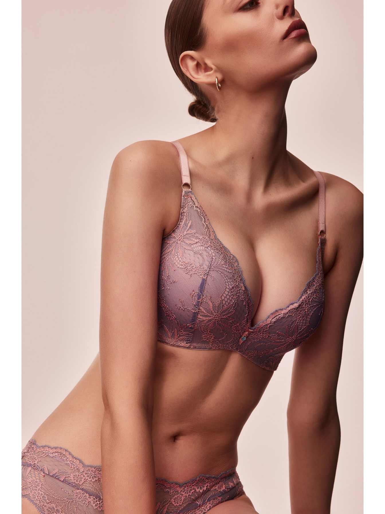 Бескаркасный бюстгальтер Madera с формованными чашками супер пуш-ап выполнен из роскошного сиреневого кружева с цветочным узором. Бретельки регулируются по длине, на спине застежка на крючки-петли. Между чашек красивое украшение в виде подвески и атласной ленточки. Комфортный бюстгальтер подойдет под любую одежду. Чашечки поддерживают и максимально увеличивают бюст, создают пышное декольте.