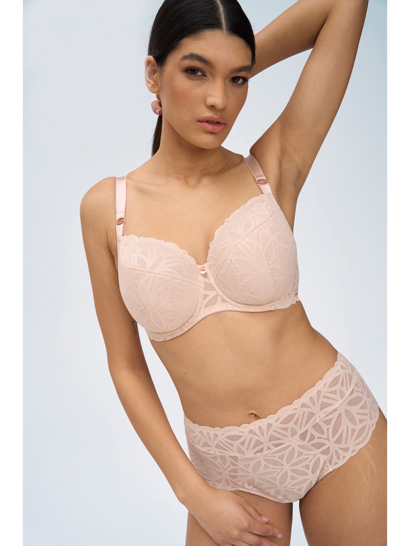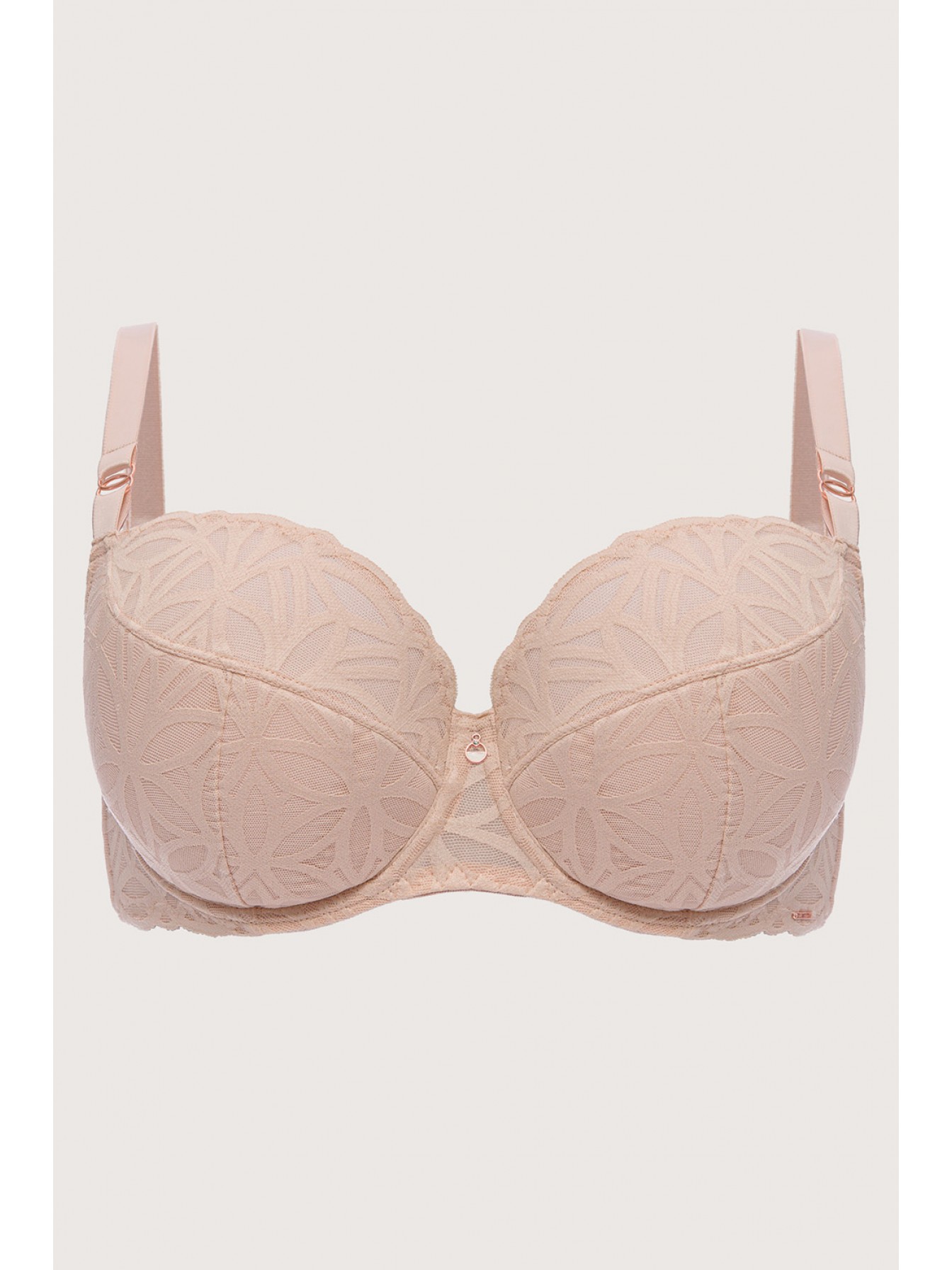 Бюстгальтер Sugar Dune на косточках, с боковой поддержкой, нижняя часть чашки на уплотнителе, верхняя из нежного кружева. Внутри чашечки проложены хлопковым трикотажем. Бретельки не отстегиваются, регулируются по длине. Между чашек красивое украшение в виде подвески. На спинке застежка регулируется.