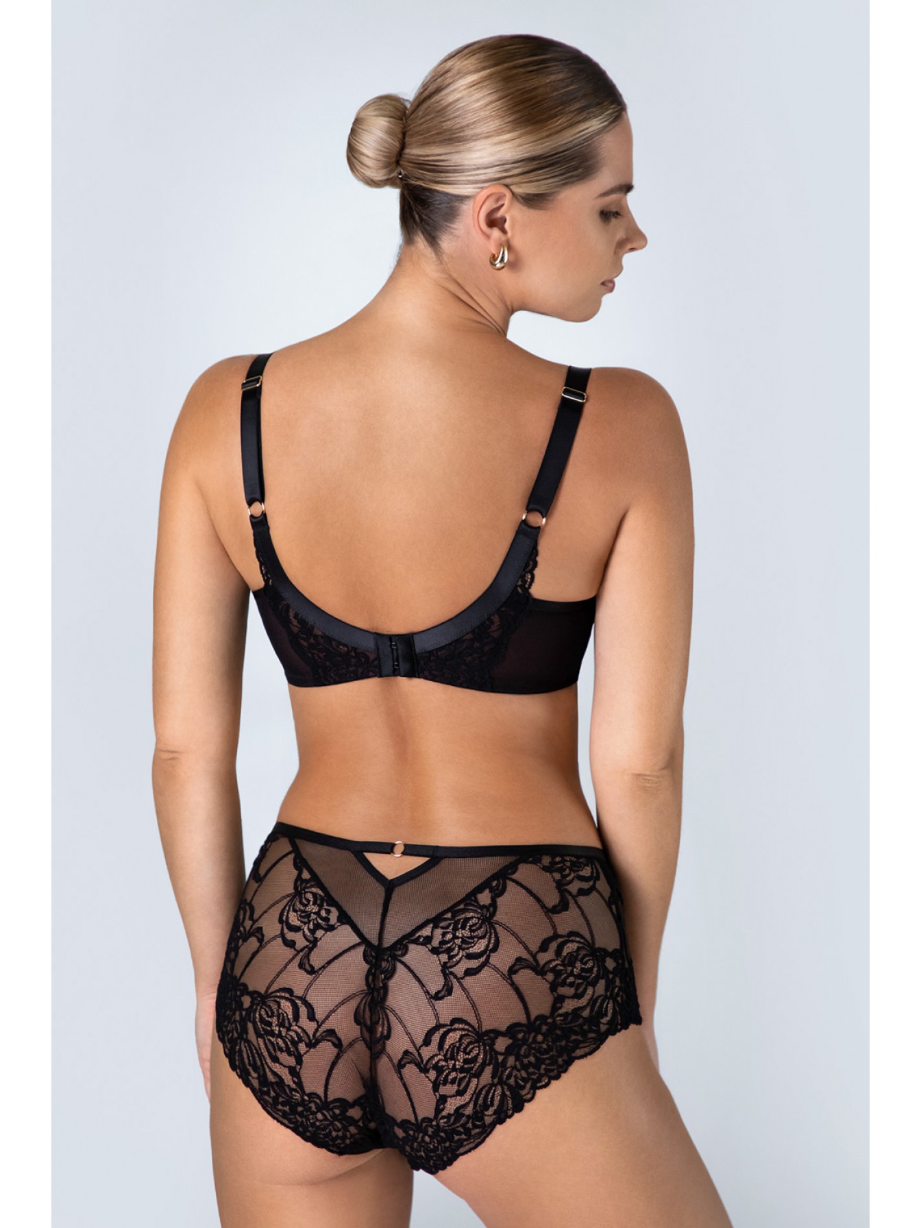 Бюстгальтер Truffle Noir на косточках, с боковой поддержкой, нижняя часть чашки на уплотнителе, верхняя из нежного кружева. Внутри чашечки проложены хлопковым трикотажем. Бретельки не отстегиваются, регулируются по длине. На спинке застежка регулируется.