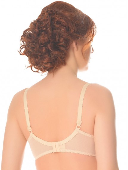 Бежевый бюстгальтер с мягкими чашками на косточках. Боковая часть с корректирующей деталью, собирающей грудь к центру. Эффектное кружево в верхней части придает этой модели женственность и нарядность. Бюстгальтер, который обязательной должен присутствовать в гардеробе.