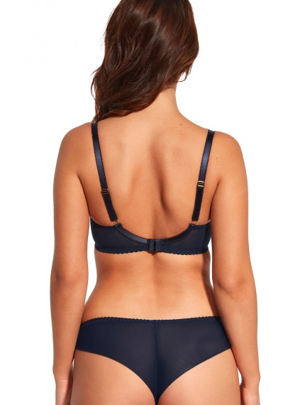 Темно-синий бюстгальтер-бралетт из линейки Subtle temptation. Мягкие чашки из эксклюзивной вышивки, выполнены по технологии плоских швов, обеспечивая максимальный комфорт и незаметность под одеждой. Низкая перемычка идеально сочетается с одеждой с глубоким вырезом Спинка выполнена из очень мягкого двойного тюля. Безникелевые украшения гарантируют отсутствие аллергических реакций.