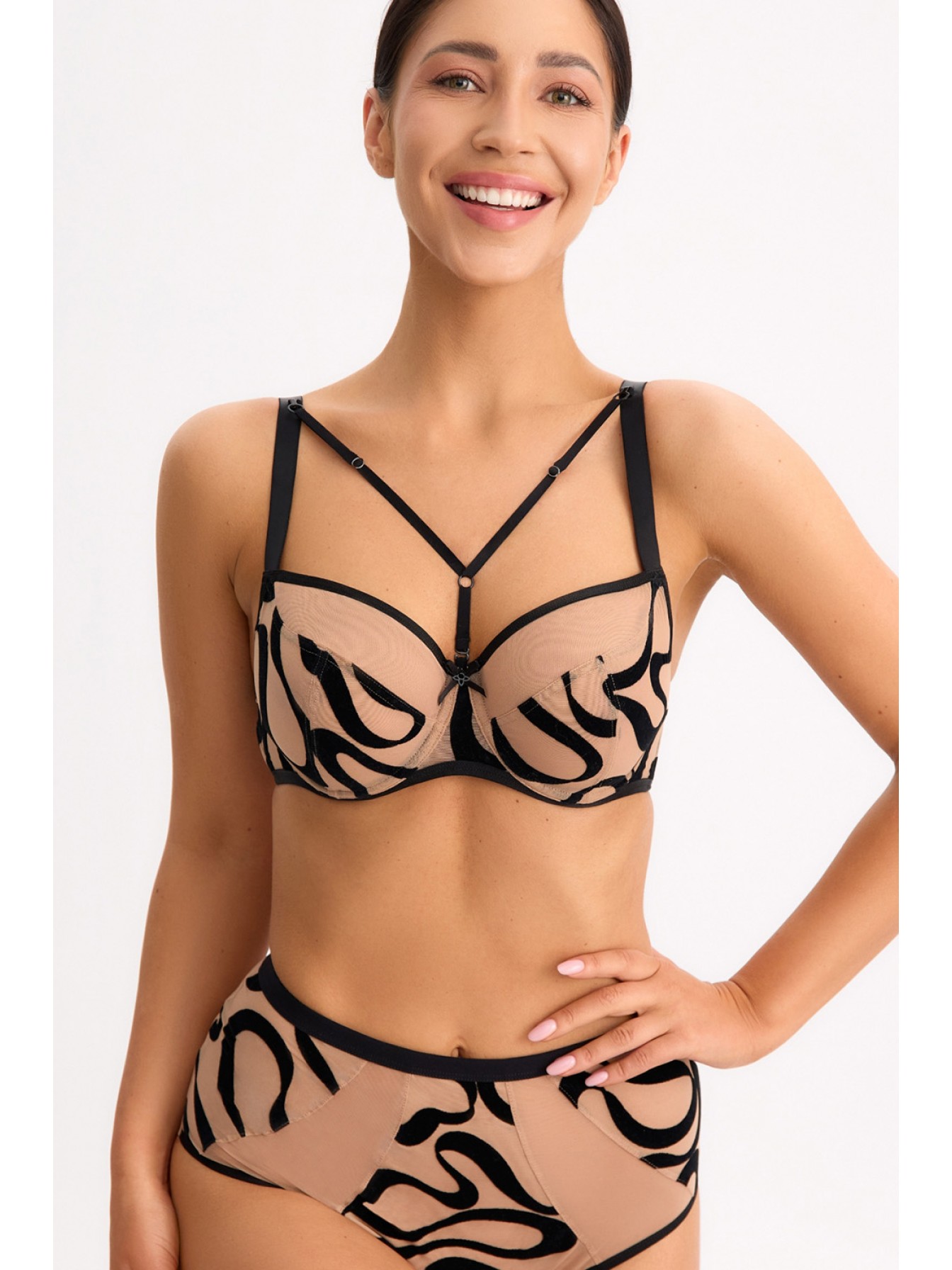 Мягкий бюстгальтер из линейки Black Agate с чашками из вышитого фатина, декорирован стрэпами. Верхняя часть чашки отделана кантом по технологии плоского шва. Благодаря инновационной технологии, двойные подвижные боковые косточки идеально адаптируются к телу при каждом движении. Боковая часть чашки плавно переходит в бретель, собирает бюст, приподнимает его и моделирует. Бретели регулируются по ширине под размер бюстгальтера. Аксессуары и украшения не содержат никель.