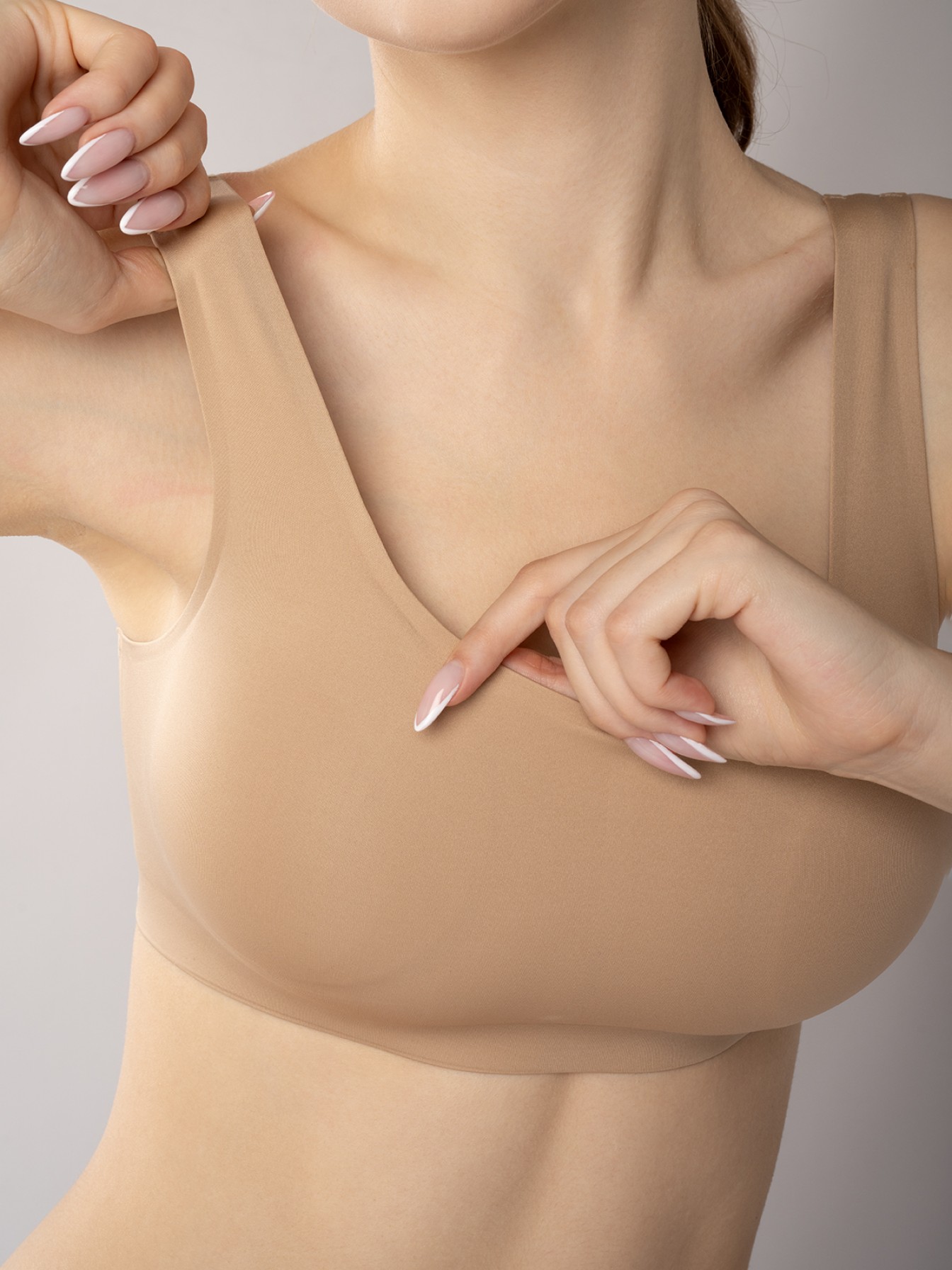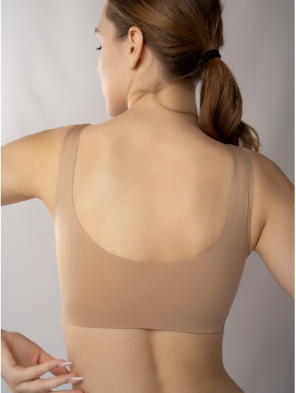 Современный бежевый бюстгальтер выполнен из мягкого эластичного материала, обеспечивающего комфортную посадку и свободу движений. Модель не имеет каркасных косточек и застёжек, что делает её максимально удобной для повседневной носки.