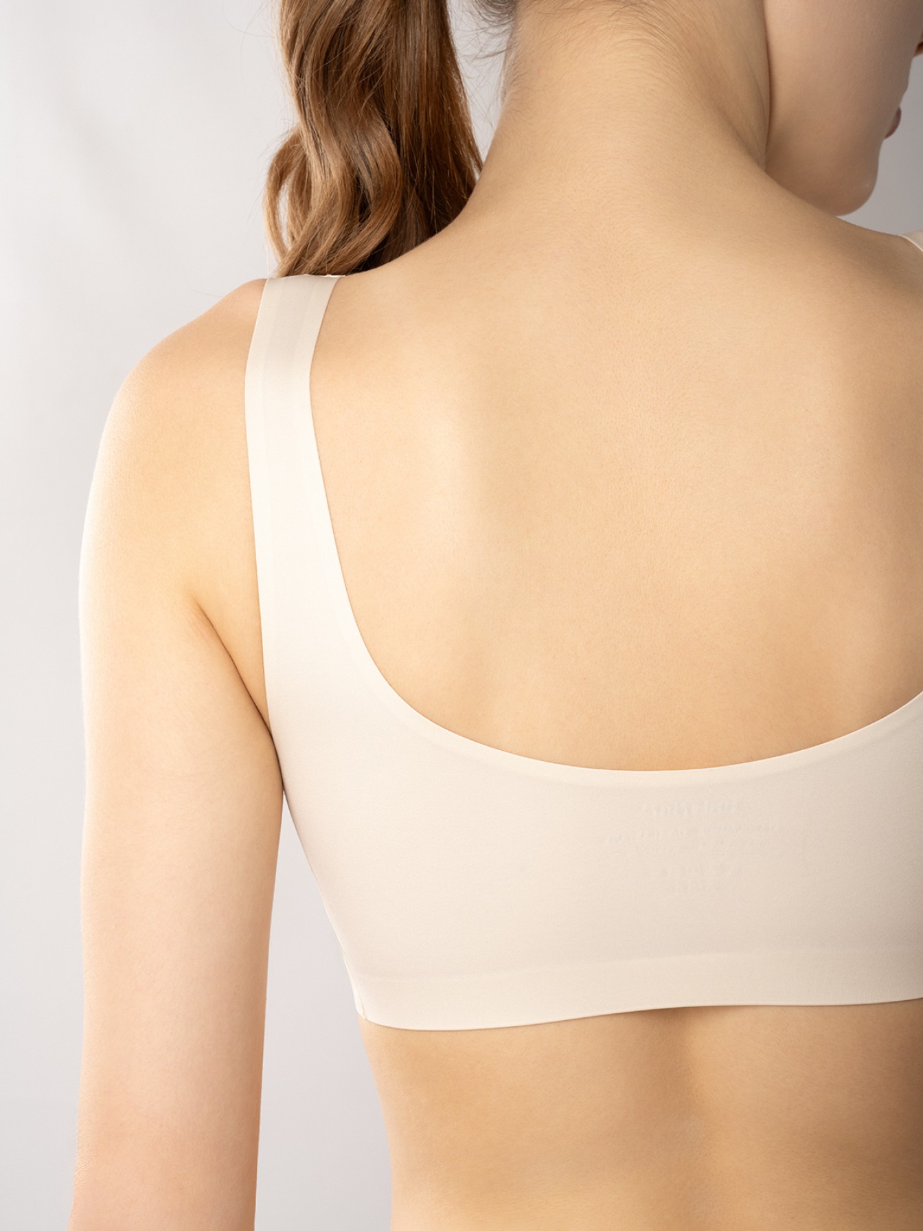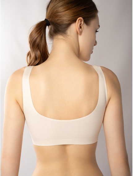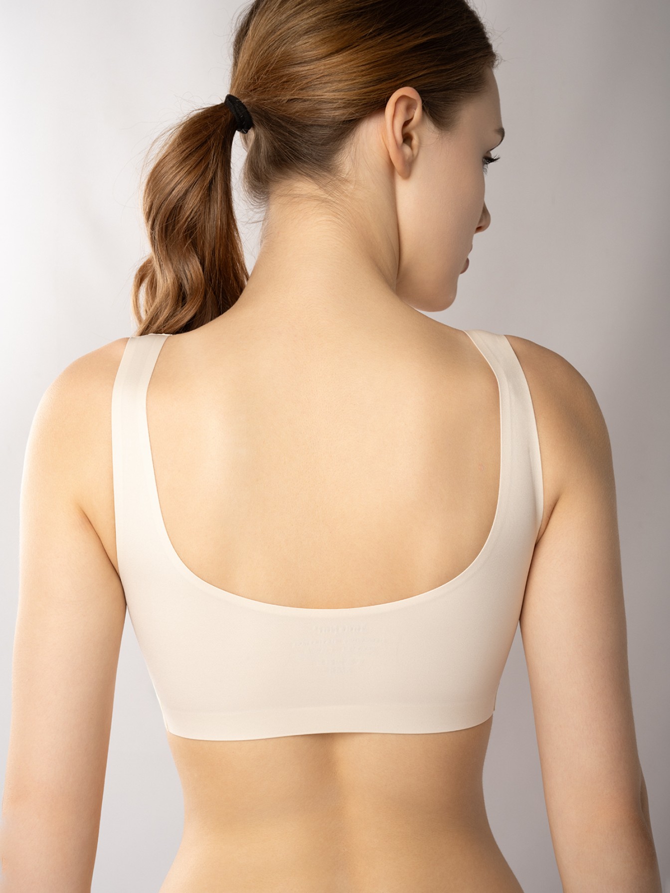 Современный белый бюстгальтер выполнен из мягкого эластичного материала, обеспечивающего комфортную посадку и свободу движений. Модель не имеет каркасных косточек и застёжек, что делает её максимально удобной для повседневной носки.