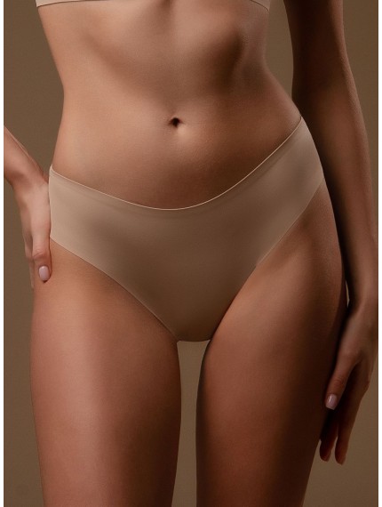 Бюстгальтер-топ бежевого цвета изготовлен из эластичной синтетической ткани с высококачественным клеевым краем, с отсутствием швов, дополнен мягкими чашками-вкладышами без Push-up, без косточек, на широких бретелях, объем под грудью регулируется застежкой на крючках.Трусы-слипы бежевого цвета, изготовлены из эластичной синтетической ткани с высококачественной клеевой обработкой срезов, дополнены гигиенической хлопковой ластовицей, средней посадки