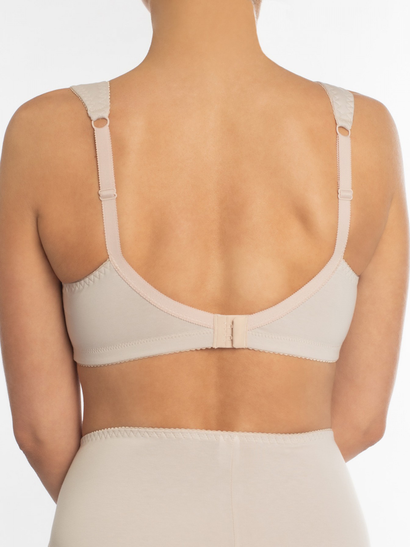 Комфортный хлопковый бюстгальтер, без каркасов и боковых пластин на большую размерную группу. Чашка с Т-образным швом и вставкой из эластичного кружева, продублированного сеточкой. Низ чашки с внутренней стороны с тонкой поддерживающей поролоновой деталью. Передняя часть бретели — широкая, комфортная, на поролоне, задняя часть - из эластичной тесьмы, распределяют нагрузку от большой груди и убирают вес с плеч. Застежка на три крючка, два варианта объема. Благодаря боковому подкрою из поролона, великолепно поддерживает грудь. Такая же модель на большие объёмы чашек G,H,I,J,K - 1104 (по ссылке)