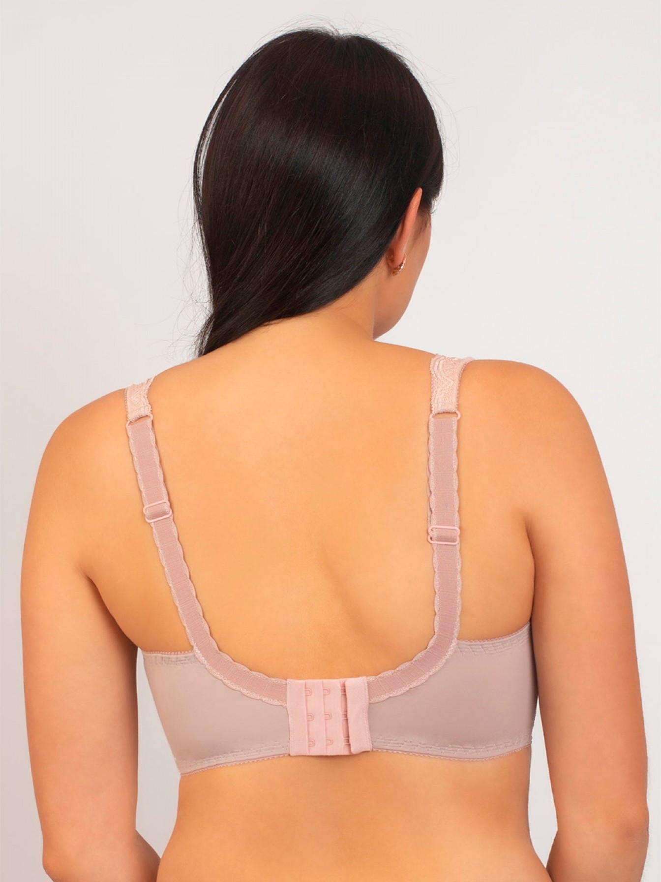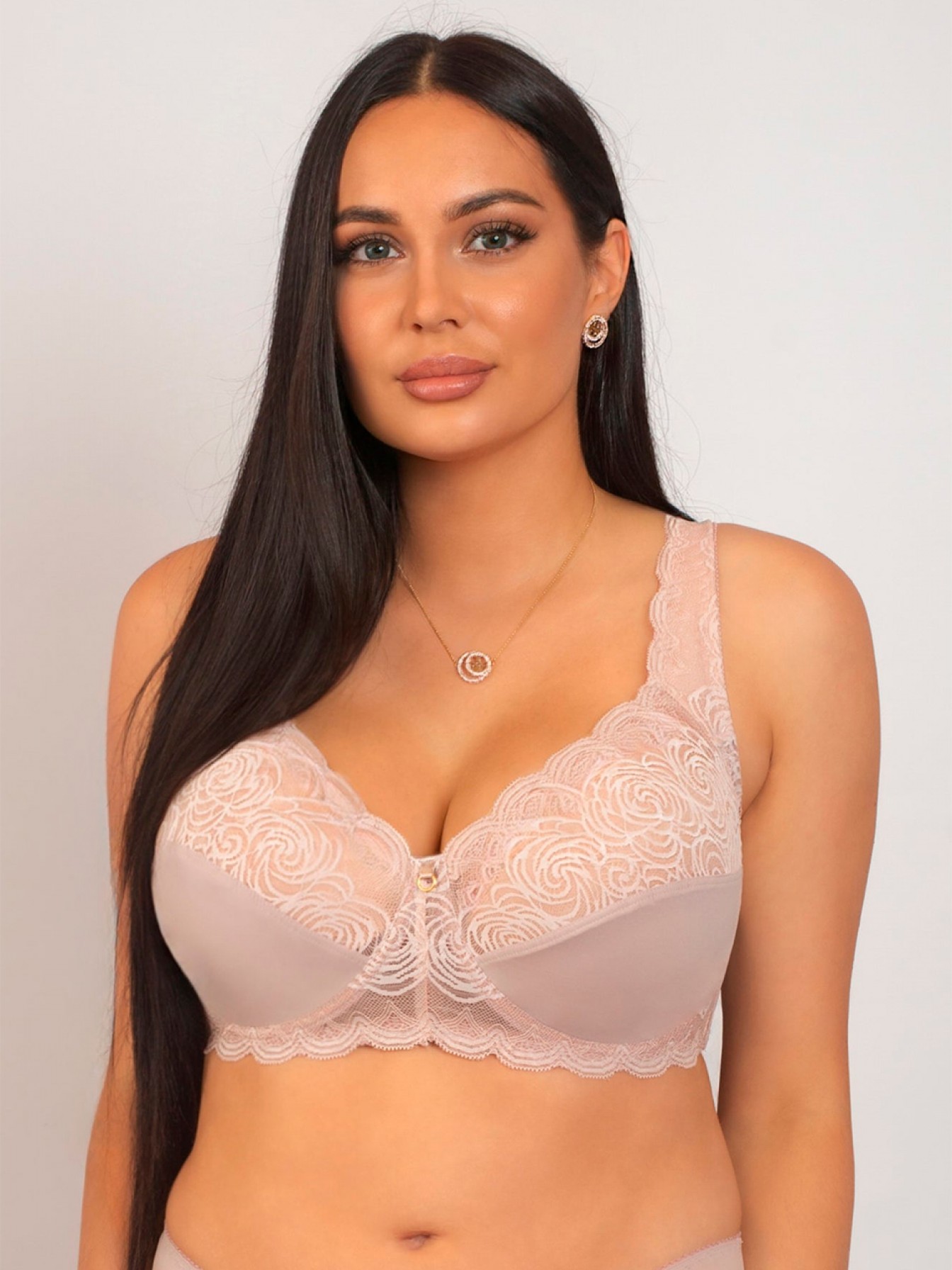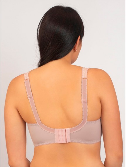 Полукружевной бюстгальтер розового цвета с мягкими чашечками на каркасах. Выполнен из кружева и нежной микрофибры. Нижняя часть чашки изнутри продублирована хлопком. Комфортная модель для пышной груди.