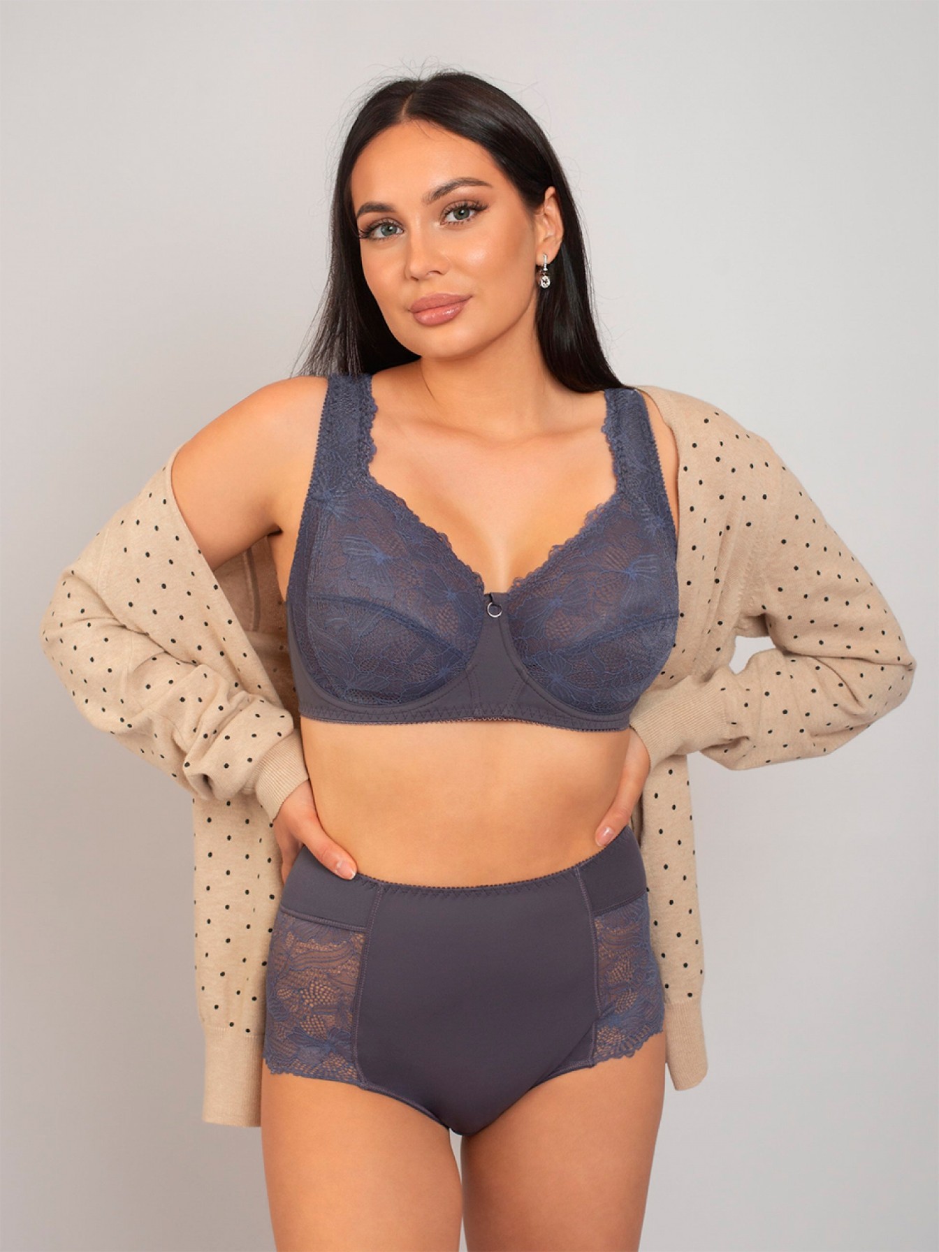 Красивый кружевной бюстгальтер закрытого типа с широкими бретелями. Мягкая чашка на каркасах. Бочки и спинка из плотной ткани, внутри бюстгальтер дублирован хлопком для большего комфорта. Эта модель на чашки объёма F, G, H. На меньшие объёмы C, D, E - такая же модель - 1212.