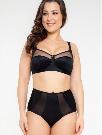Бюстгальтер черного цвета. Детали чашки, а также передняя деталь стана выполнены из мягкого неэластичного трикотажного полотна, дублированного хлопком, что обеспечивает поддержку и комфорт. Задняя деталь стана из функционального эластичного полотна. Верхняя деталь чашки из прозрачного сетчатого полотна. Чашки с тройным Т-образным членением и боковой корректирующей деталью.Бюстгальтер без каркасов, с боковыми упругими пластинами.