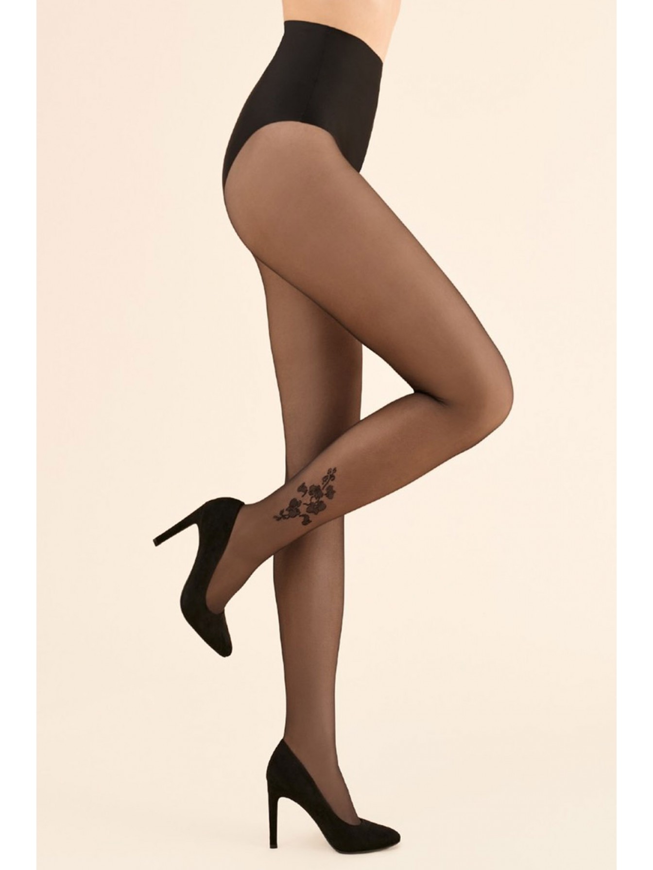 Черные колготки Flavia 20 den с нежным цветочным узором, имитирующим женскую татуировку, чуть выше щиколотки. Отсутствие отдельной секции для трусиков, невидимое усиление на пальцах и хлопковая ластовица с плоским швом гарантируют удобство и комфорт использования тонких колготок.
