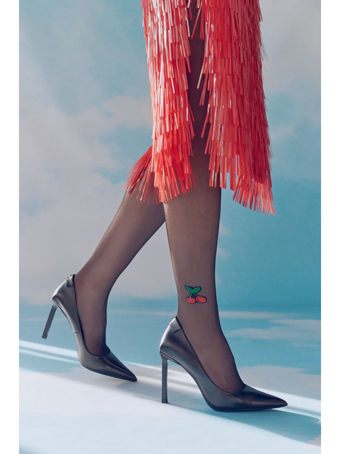 Колготки Cherry 20 den с вишней привлекают внимание характерным красочным рисунком чуть выше щиколотки. Отсутствие отдельной секции для трусиков, невидимое усиление на пальцах и хлопковая ластовица с плоским швом гарантируют удобство и комфорт использования тонких колготок.