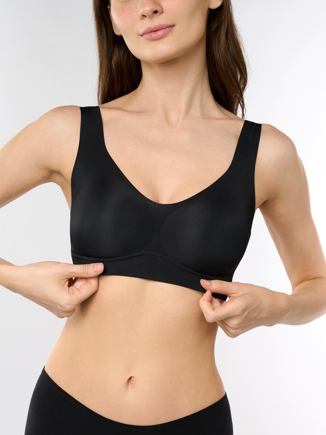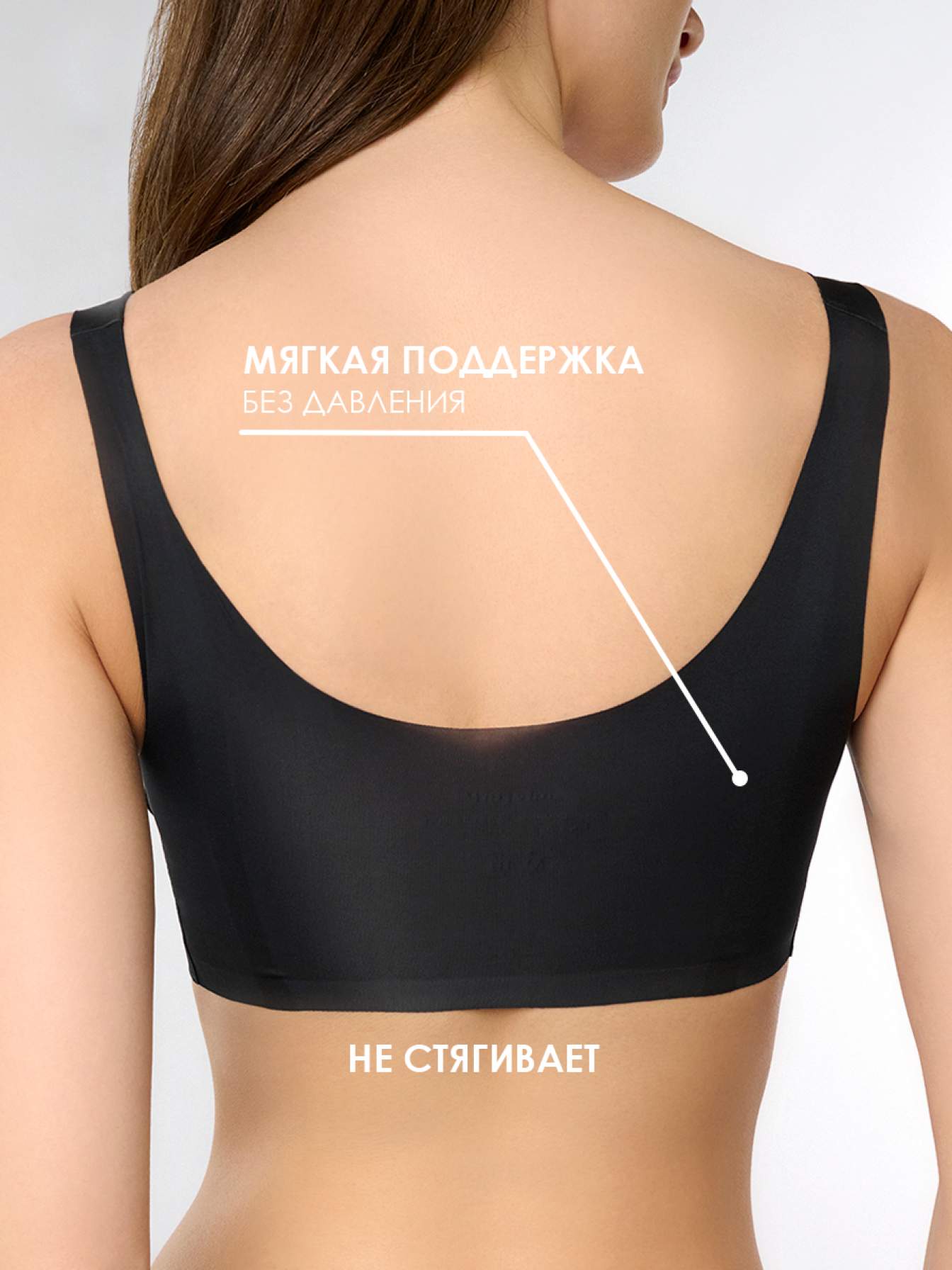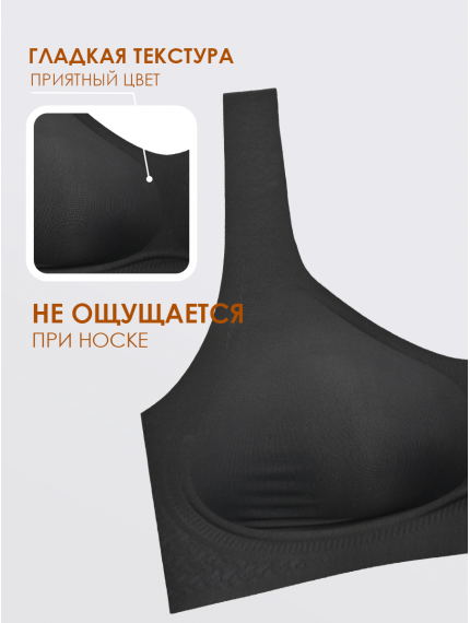 Чёрный бюстгальтер-топ без косточек.Современный чёрный бюстгальтер выполнен из мягкого эластичного материала, обеспечивающего комфортную посадку и свободу движений. Модель не имеет каркасных косточек и застёжек, что делает её максимально удобной для повседневной носки.