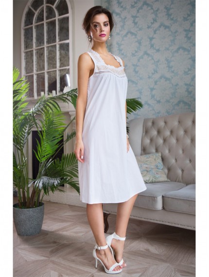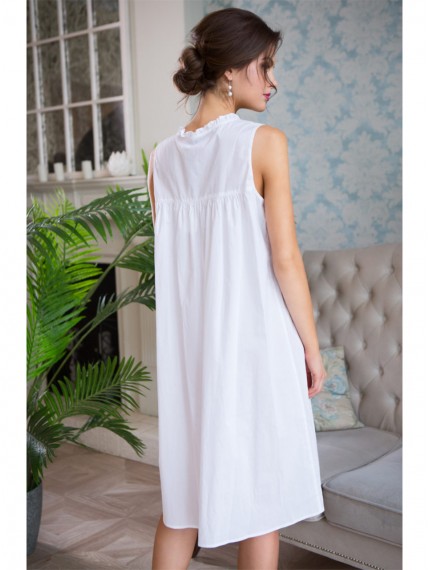 Длинная сорочка свободного силуэта на широких бретелях выполнена из хлопка. Декором сорочки является вышивка расположенная на кокетке и бретелях. По горловине проходит узкая рюша. Низ кокетки подчеркнут кружевом. Спинка на кокетке, нижняя часть спинки со сборкой.