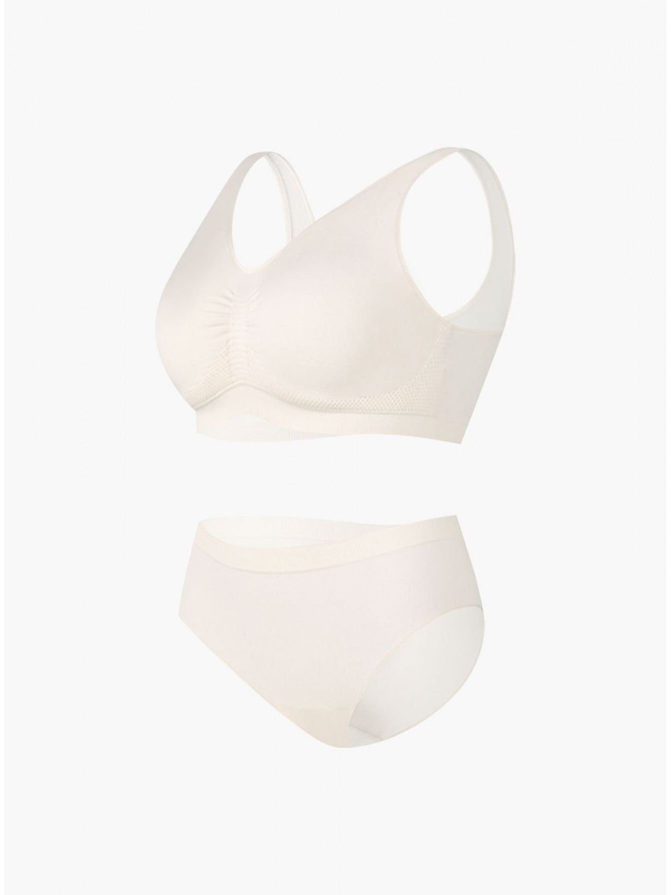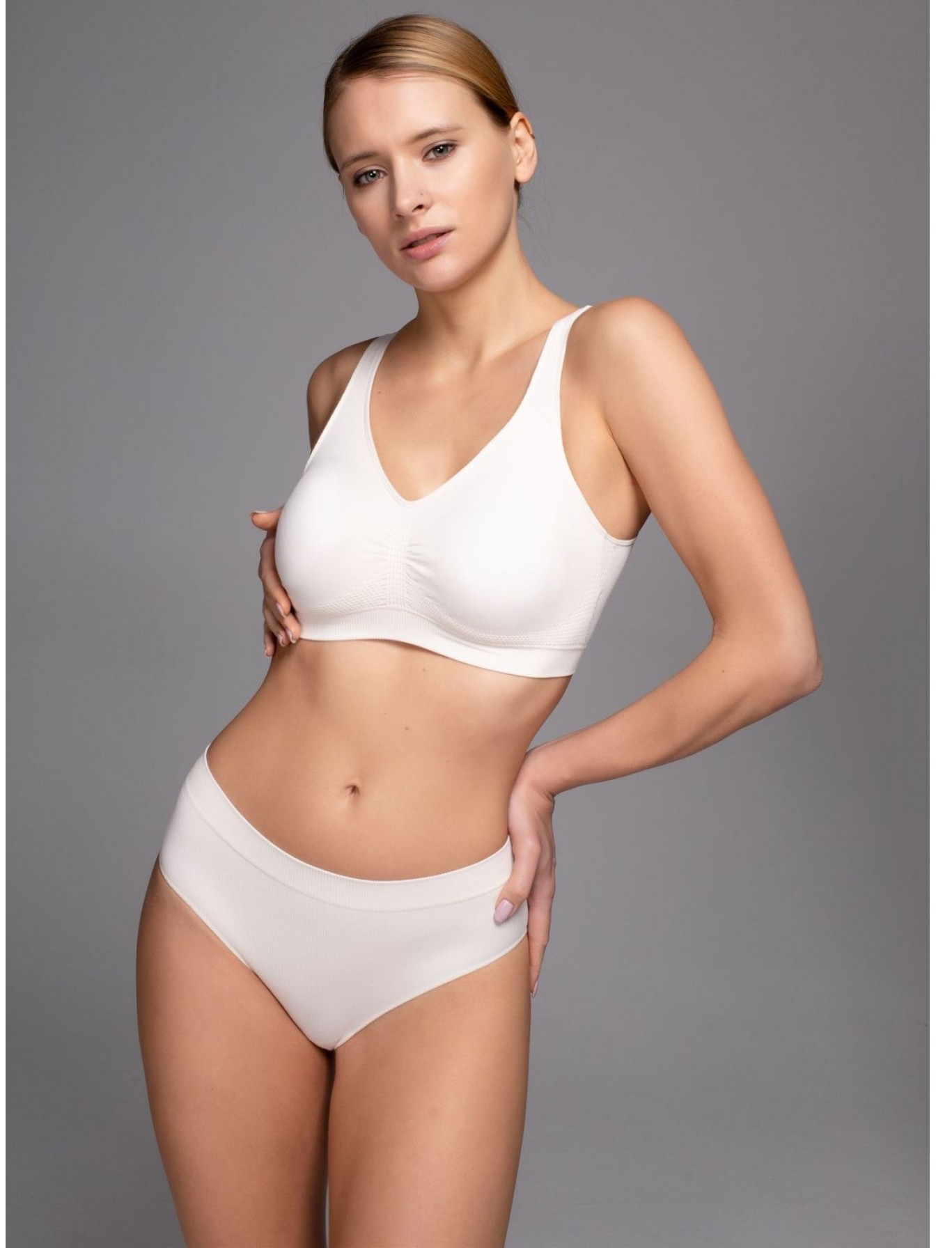 Комплект нижнего белья от торговой марки Индефини. В комплекте бюстгальтер и трусики. Бюстгальтер-топ из полиамида, молочного цвета, c поролоновыми чашками, без Push-up, без косточек, на мягкой резинке на поясе, на широких лямках, без застежек, лямки не регулируются, в рубчик. Трусы-слипы из полиамида, молочного цвета, в рубчик, бесшовные, на мягкой резинке.