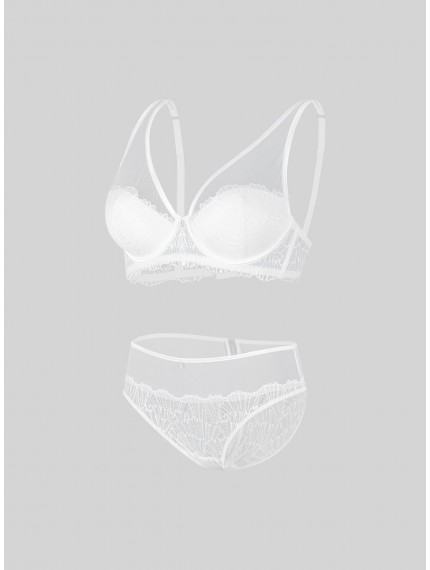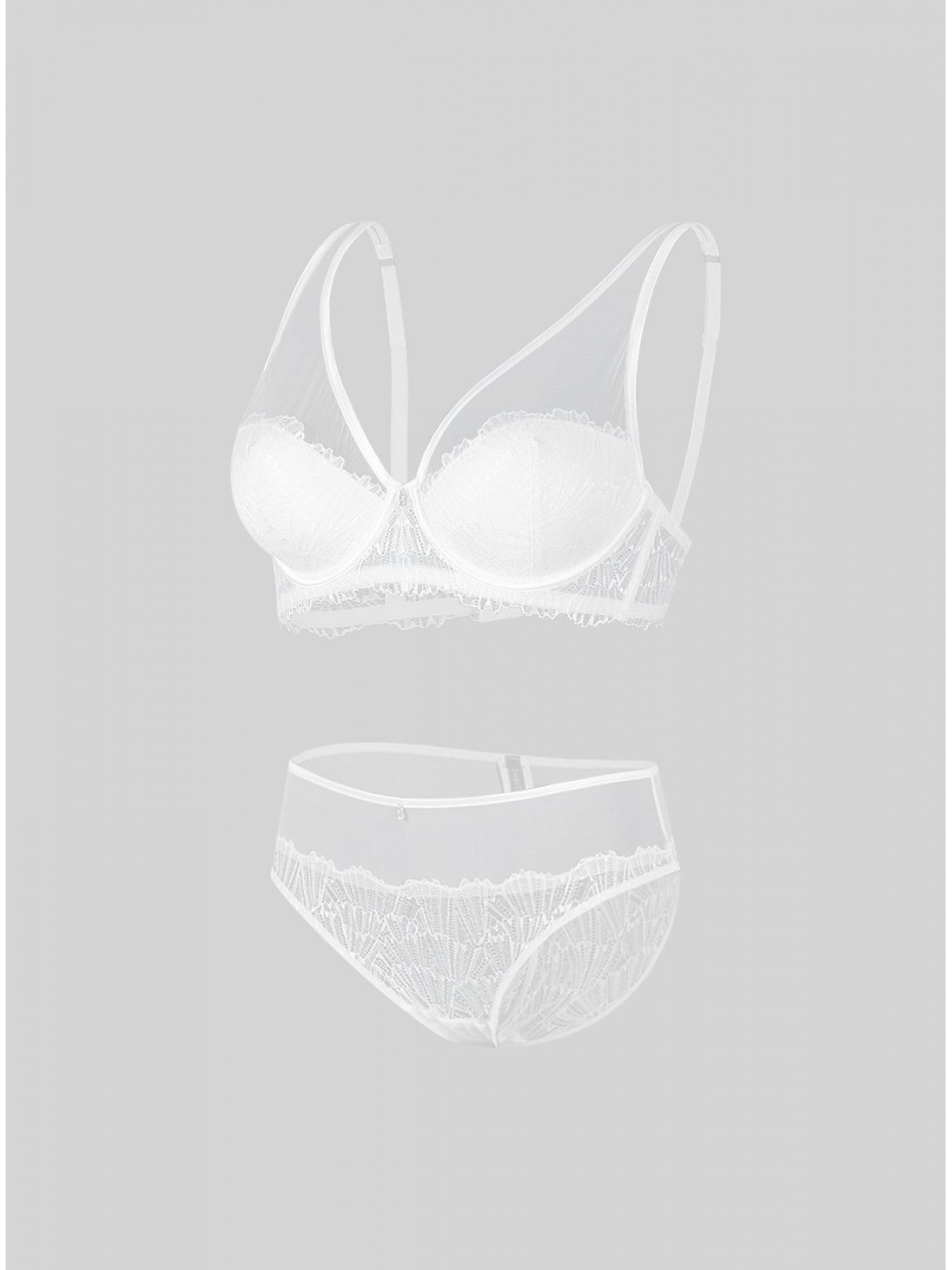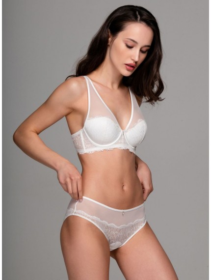 Комплект нижнего белья от торговой марки Индефини. В комплекте бюстгальтер и трусики. Бюстгальтер из полиамида, белого цвета, с кружевными вставками и обрамлением, на косточках, без Push-up, с косточками по бокам, со вставками из микросетки, на тонких бретелях, на застежках-крючках, бретели регулируются. Трусы-слипы из полиамида, белого цвета, с кружевными вставками и обрамлением, на мягкой резинке, средней посадки.