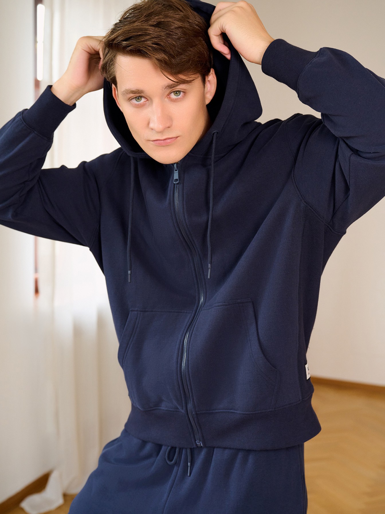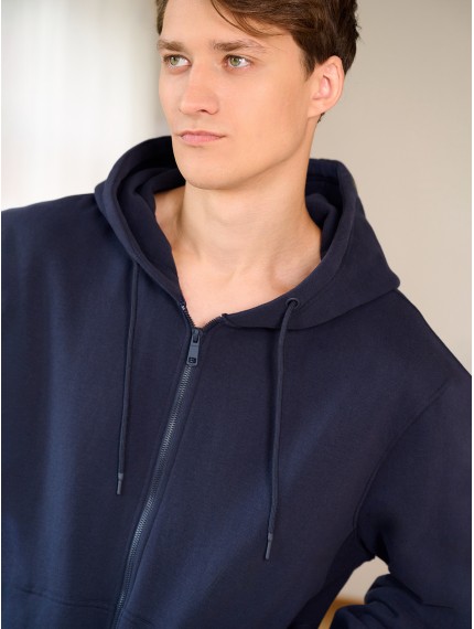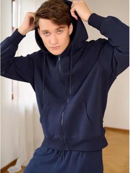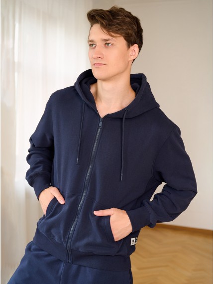 Мужской трикотажный утепленный костюм Indefini с начесом выполнен в глубоком, насыщенном темно-синем цвете — оттенке, который подчеркивает уверенность и стиль даже в повседневной одежде. Комплект состоит из теплой толстовки на молнии с капюшоном, а также брюк с эластичной резинкой по талии и шнурком для регулировки посадки.