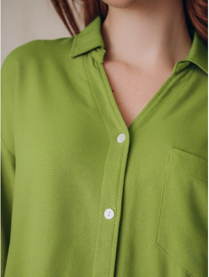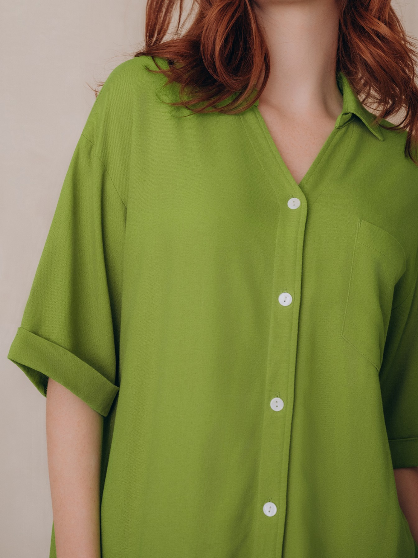 Пляжное платье 5087SDX бренда Indefini изготовлено из смеси вискозы и льна.Выполнено в зеленом цвете.Платье с короткими рукавами и отложным воротником застёгивается на пуговицы и имеет нагрудный карман.Платье свободного прямого кроя.