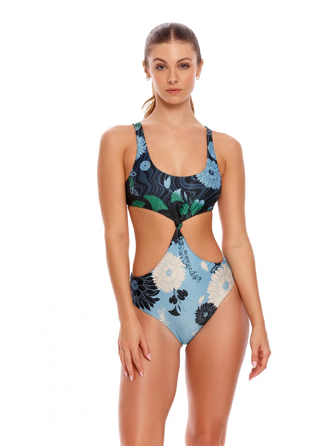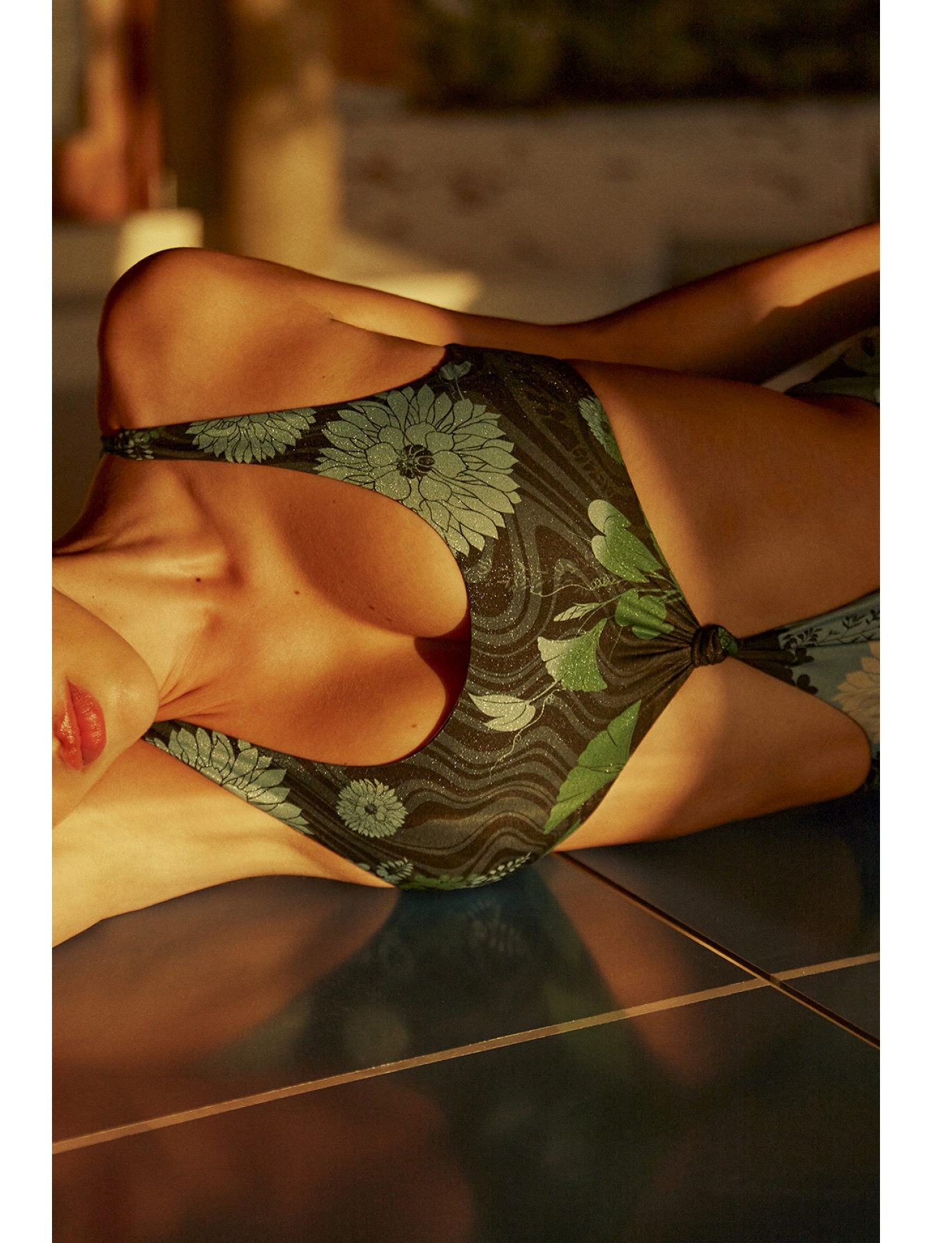 Купальник – трикини с элегантным перекрутом спереди, на спинке удобная застежка, выполнен из эко-ткани.