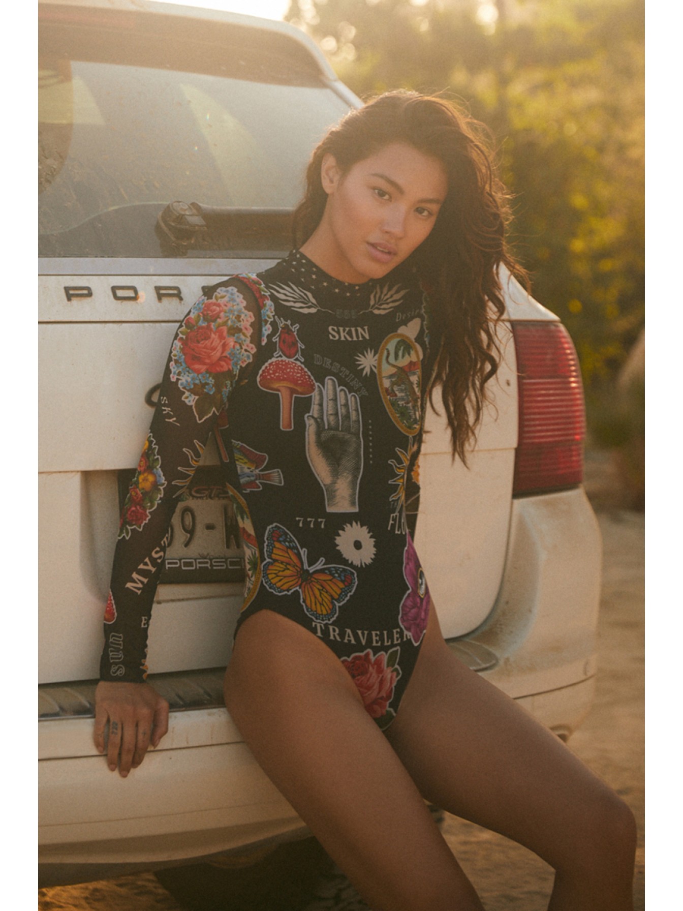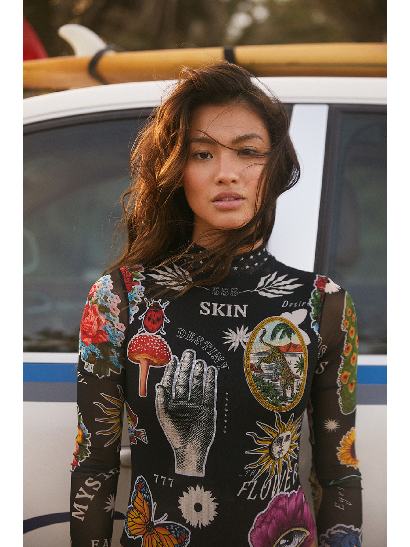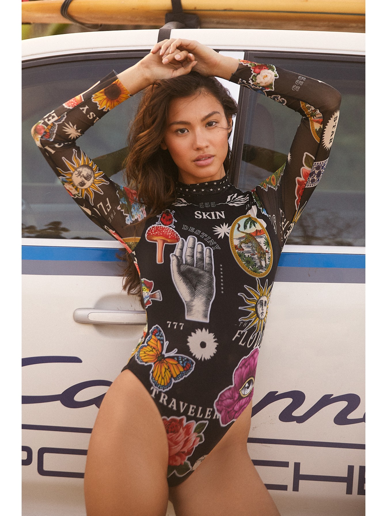 Слитный купальник Mei с трендовым контрастным принтом. Выполнен из люксовой ткани, с тактильным эффектом гладкого и легкого шелка, которая быстро сохнет и сохраняет цвет.