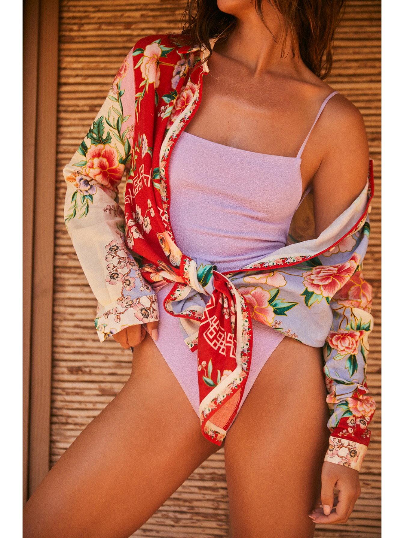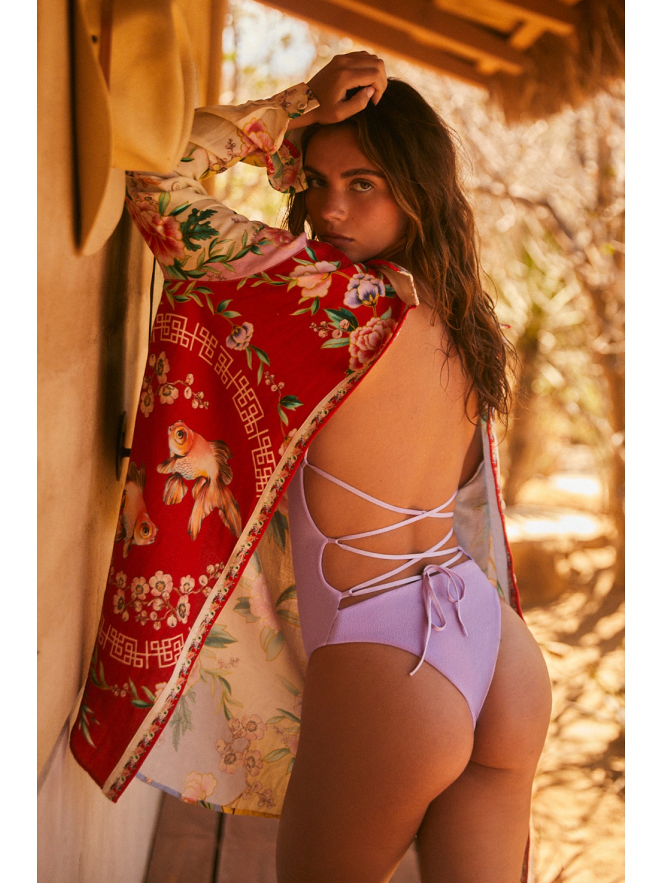 Слитный однотонный купальник Kali нежного сиреневого цвета. Выполнен из люксовой ткани, с тактильным эффектом гладкого и легкого шелка, которая быстро сохнет и сохраняет цвет. На спине тонкая шнуровка. Спинка открытая до линии поясницы.