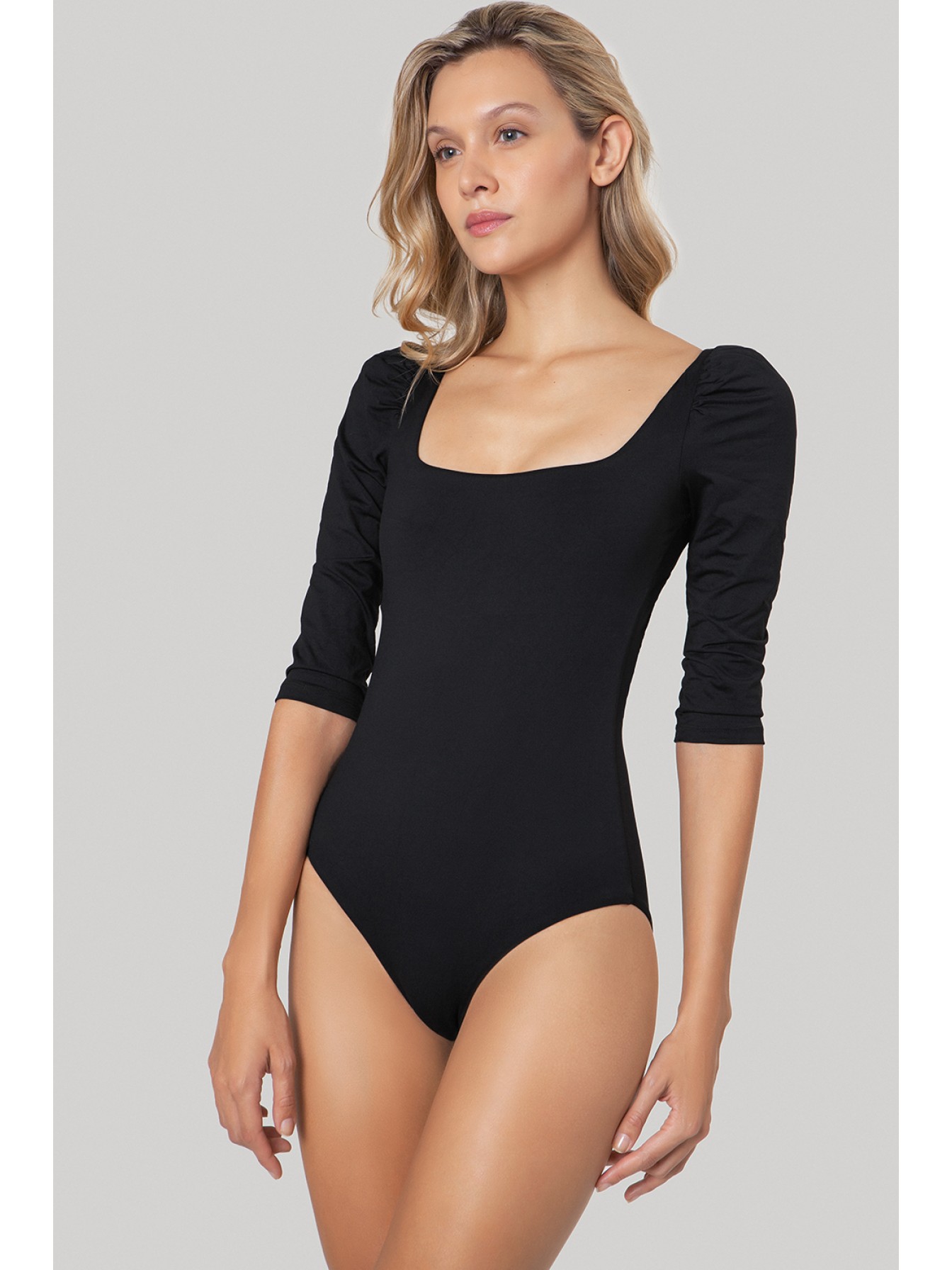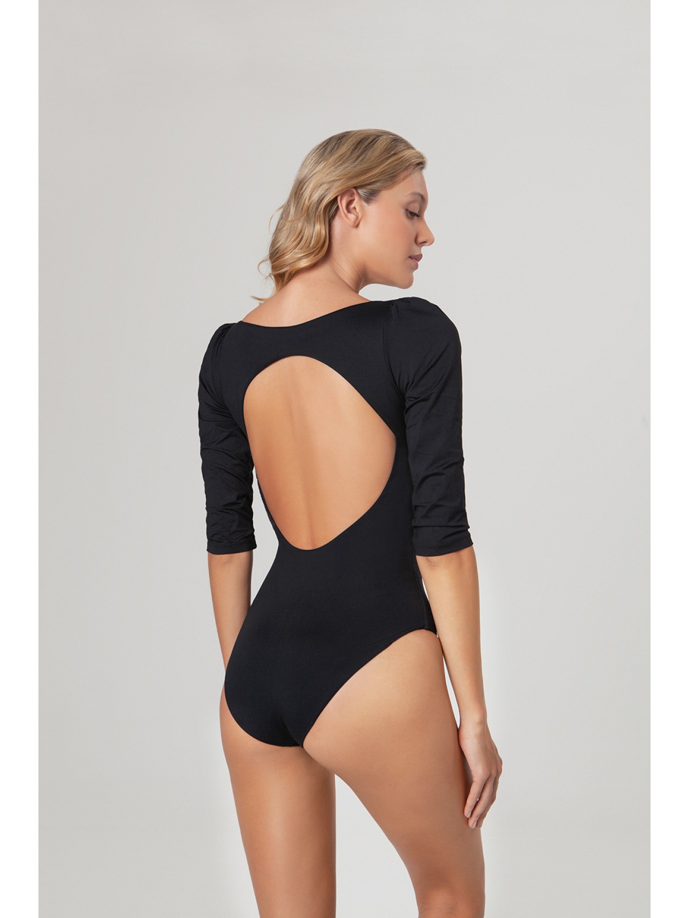 Слитный купальник с открытой спиной и рукавами 3/4. Выполнен из люксовой ткани с тактильным эффектом гладкого и легкого шелка, которая быстро сохнет и сохраняет цвет.