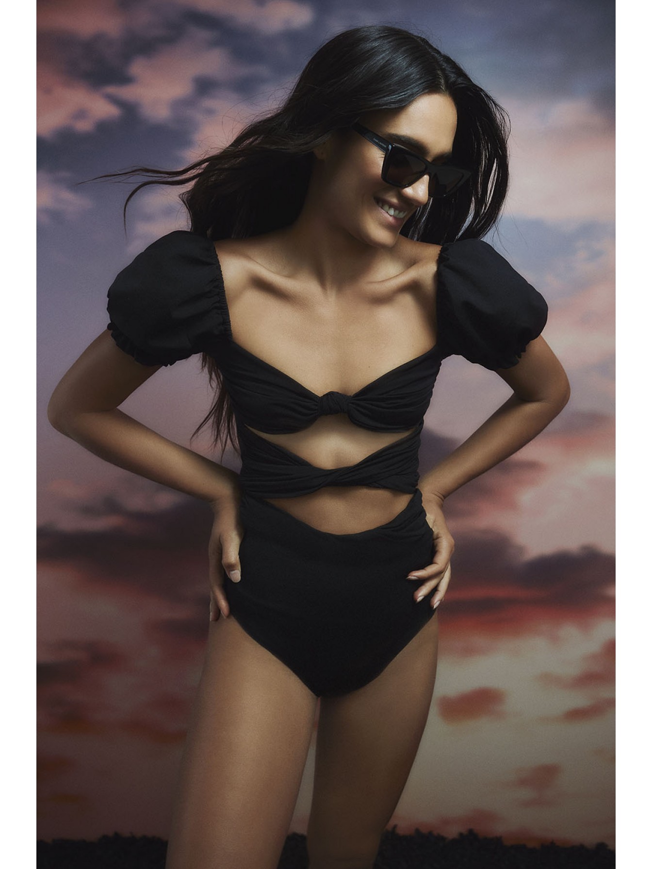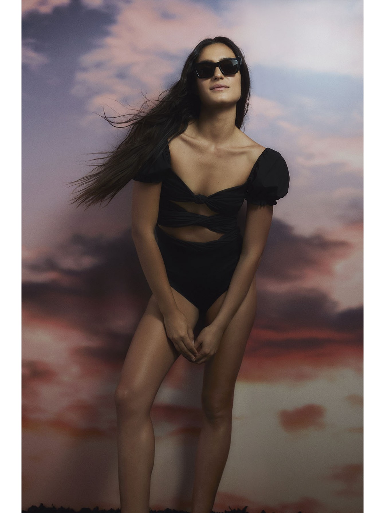 Очаровательный слитный купальник с рукавами-фонариками и завязками спереди, создающими эффект выреза. Выполнен из люксовой ткани с тактильным эффектом гладкого и легкого шелка, которая быстро сохнет и сохраняет цвет.