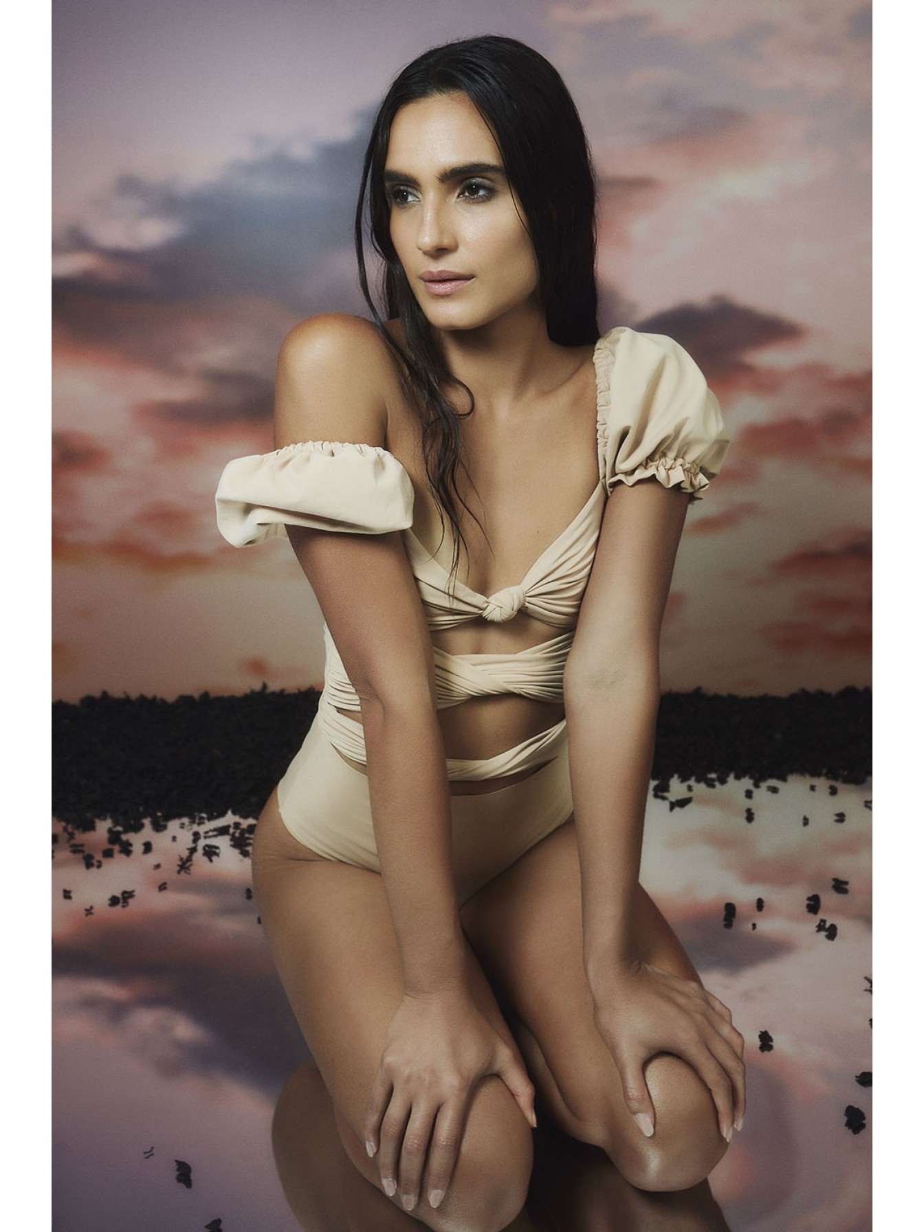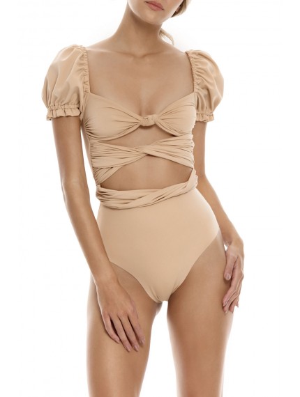 Очаровательный слитный купальник с рукавами-фонариками и завязками спереди, создающими эффект выреза. Выполнен из люксовой ткани с тактильным эффектом гладкого и легкого шелка, которая быстро сохнет и сохраняет цвет.