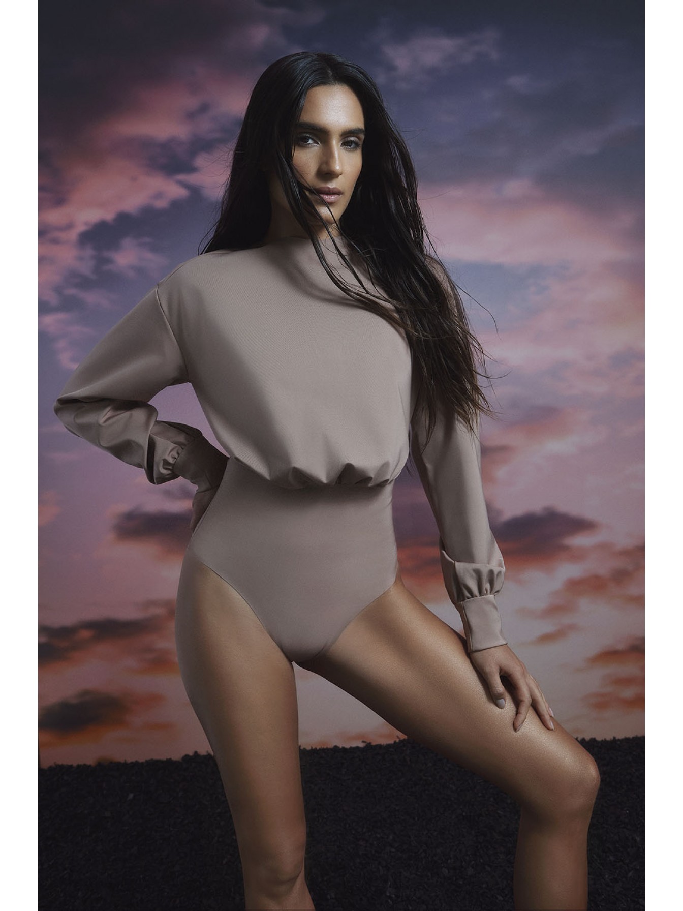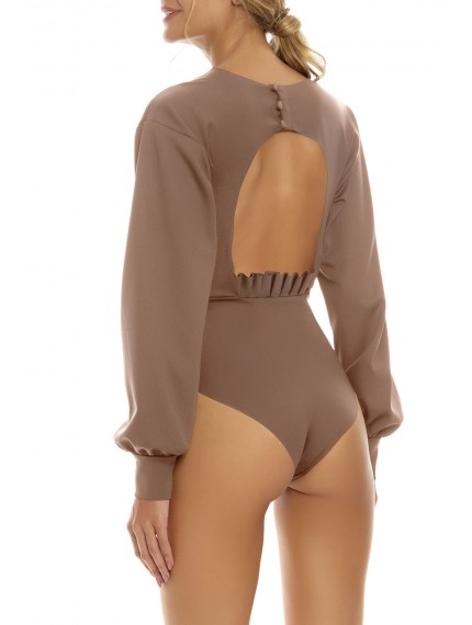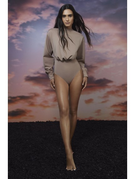 Слитный купальник с высокой горловиной и открытой спиной, с длинными рукавами и манжетами.