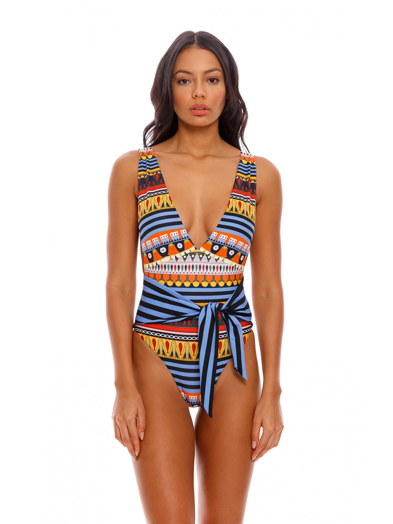 Слитный купальник с V-образным декольте и стильными широкими регулируемыми бретелями на спине. Украшен элегантным поясом в виде банта. Выполнен из люксовой ткани, с тактильным эффектом гладкого и легкого шелка, которая быстро сохнет и сохраняет цвет.