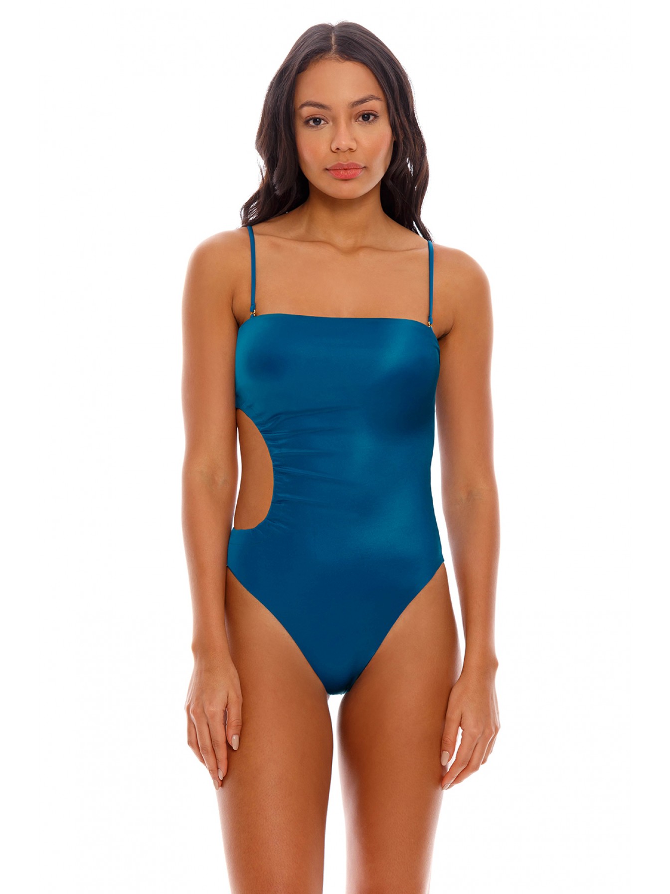 Слитный купальник на тонких регулируемых бретелях. Украшен элегантным вырезом сбоку. Выполнен из люксовой ткани, с тактильным эффектом гладкого и легкого шелка, которая быстро сохнет и сохраняет цвет.