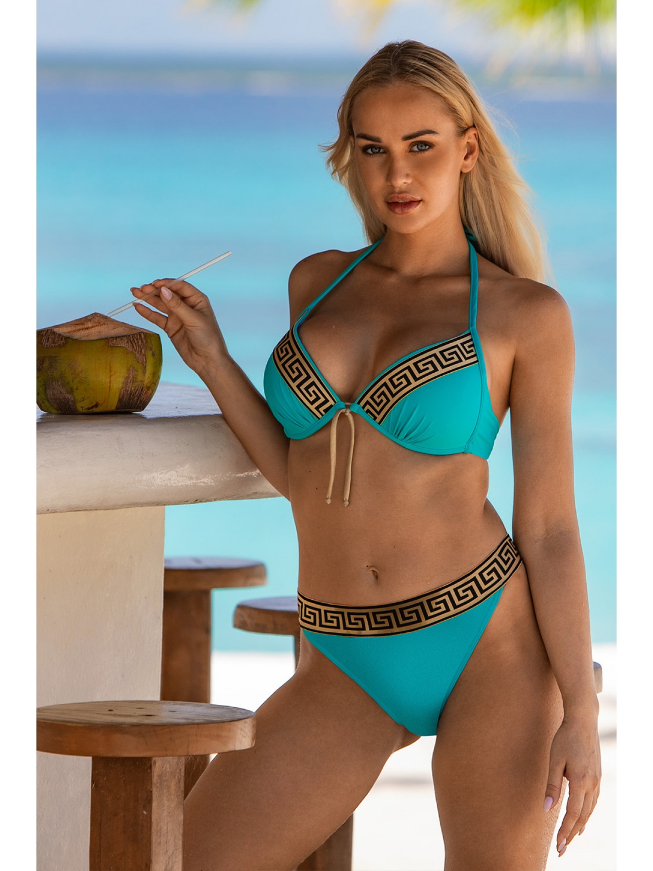 Голубой купальник Santa с геометрическим принтом. Бюстгальтер с мягкой чашкой на поролоне, завязывется на спине и шее. Плавки с подкладкой.