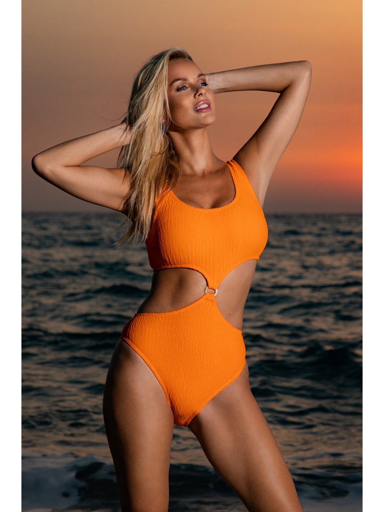 Слитный купальник выполнен из оранжевой жатой ткани с волнистым узором. Топ на широких бретелях, дополнен съемными вкладышами. Плавки классические бразилиана.