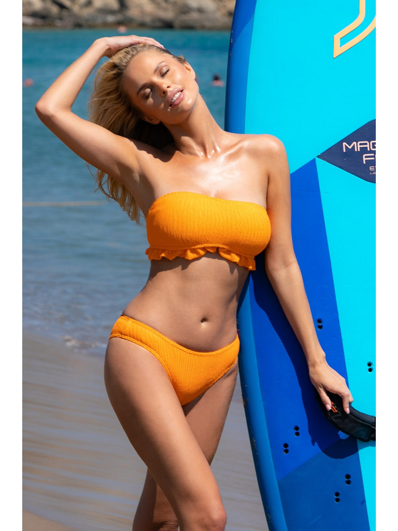 Раздельный купальник выполнен из оранжевой жатой ткани с волнистым узором. Бюст-бандо дополнен съемными вкладышами, декорирован оборкой по низу. Плавки классические бразилиана.