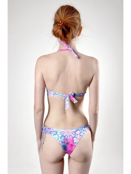 Раздельный купальник Ria с ярким принтом. Лиф с поролоновыми чашками, без косточек, завязывается за шеей и на спине для достижения лучшей посадки. Плавки-галочки с подкладкой.