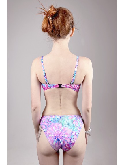 Раздельный купальник ярким розноцветным принтом. Чашка на тонком поролоне и косточках, есть боковые косточки. Низ чашки с небольшим вшитым пуш-апом. Бретели отстегиваются и регулируются по длине, пластиковая застежка на спине не регулируется. Плавки классические бразилиана.