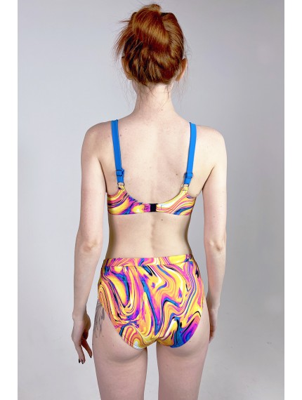 Синий купальник с ярким принтом. Формованный лиф с боковыми косточками, бретели регулируются по длине, пластиковая застежка на спине не регулируется. Плавки-слип с завышенной линией талии.