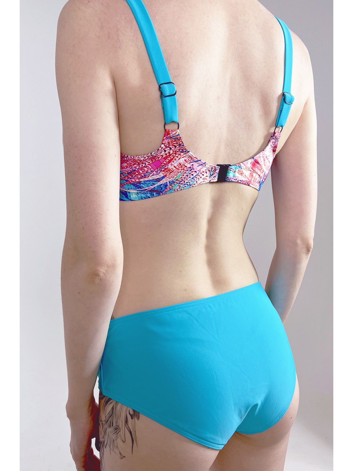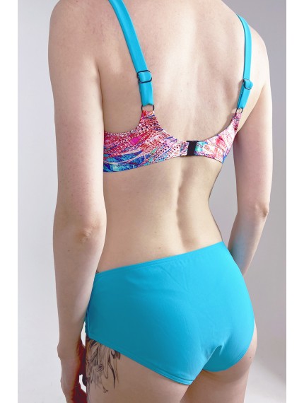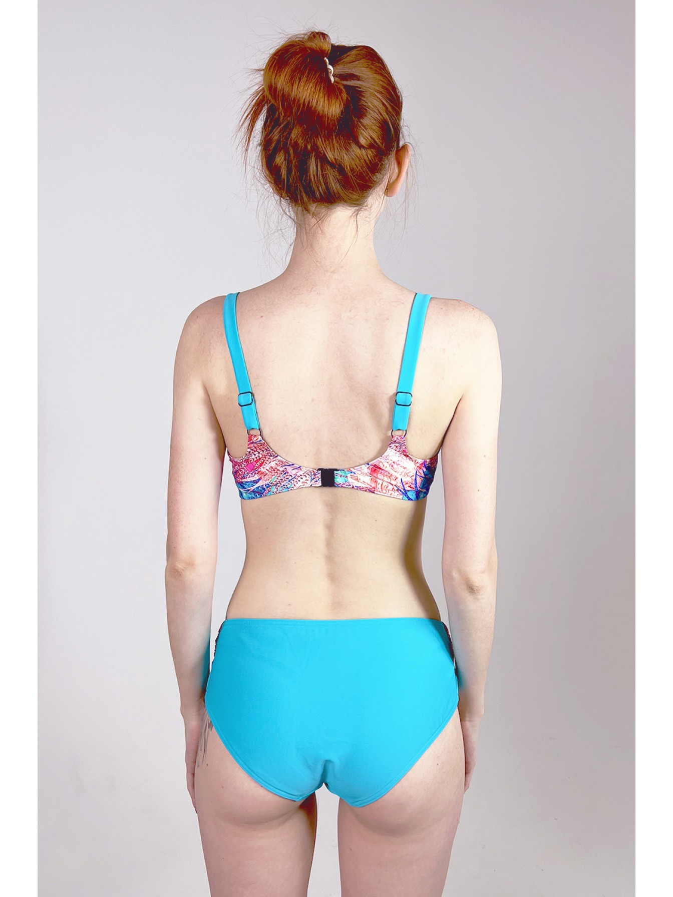 Лазурный купальник с принтом. Формованный лиф с боковыми косточками, бретели регулируются по длине, пластиковая застежка на спине не регулируется. Плавки-слип с завышенной линией талии.