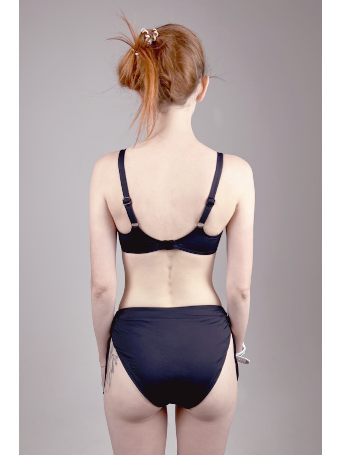 Черный купальник с принтованным лифом. Формованный лиф с боковыми косточками, бретели регулируются по длине, пластиковая застежка на спине не регулируется. Плавки с завязками для регулировки обхвата.