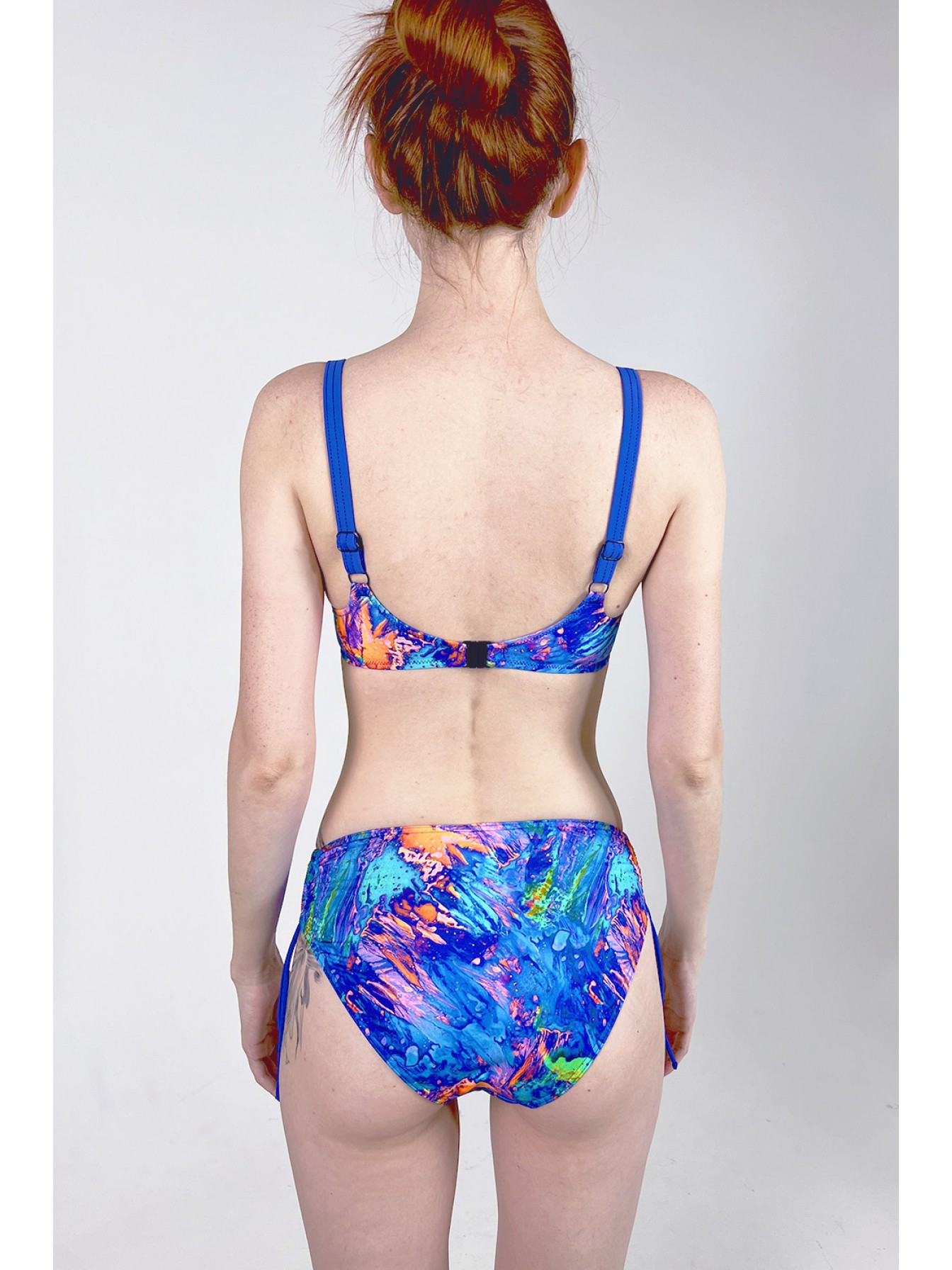 Синий купальник с разноцветным принтом. Купальник с формованной чашкой из тонкого поролона, с боковыми косточками и нерегулируемой застежкой на спине. Высокие плавки с подкладкой, с завязками для регулировки обхвата.