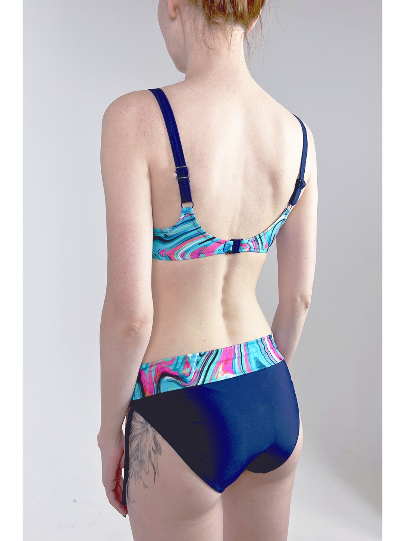 Темно-синий купальник с разноцветным принтом. Купальник с формованной чашкой из тонкого поролона, с боковыми косточками и нерегулируемой застежкой на спине. Высокие плавки с подкладкой, с завязками для регулировки обхвата, линия талии может изменяться за счет отворота в виде широкого пояса.