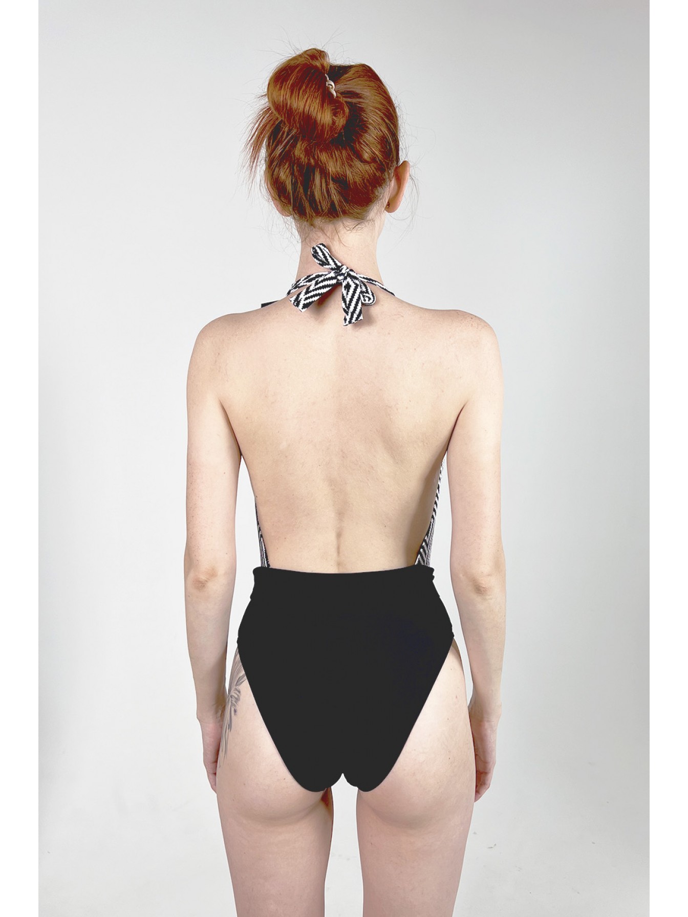 Слитный купальник Pianetta черно-белого цвета. Купальник с открытой спиной и глубоким вырезом, с высоким вырезом бедра. Модель идет с съемными вкладышами и завязывается на шее. Купальник дублирован подкладкой.