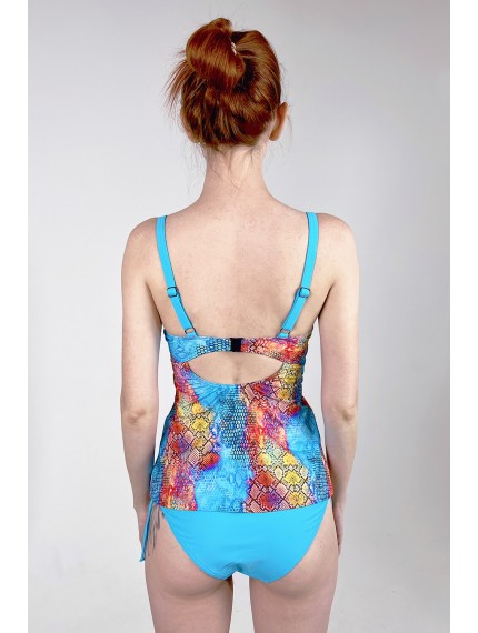 Яркий купальник-танкини с принтом. Танкини позволяет скрыть недостатки фигуры не сковывая движений. Свободный крой верха купальника идеально подходит для беременных и обладательниц пышных форм. Купальник с мягкой чашкой на косточках, с застежкой на спине, плавками с завязками для регулировки обхвата. Бретели регулируются по длине, на спинке нерегулируемая застежка.
