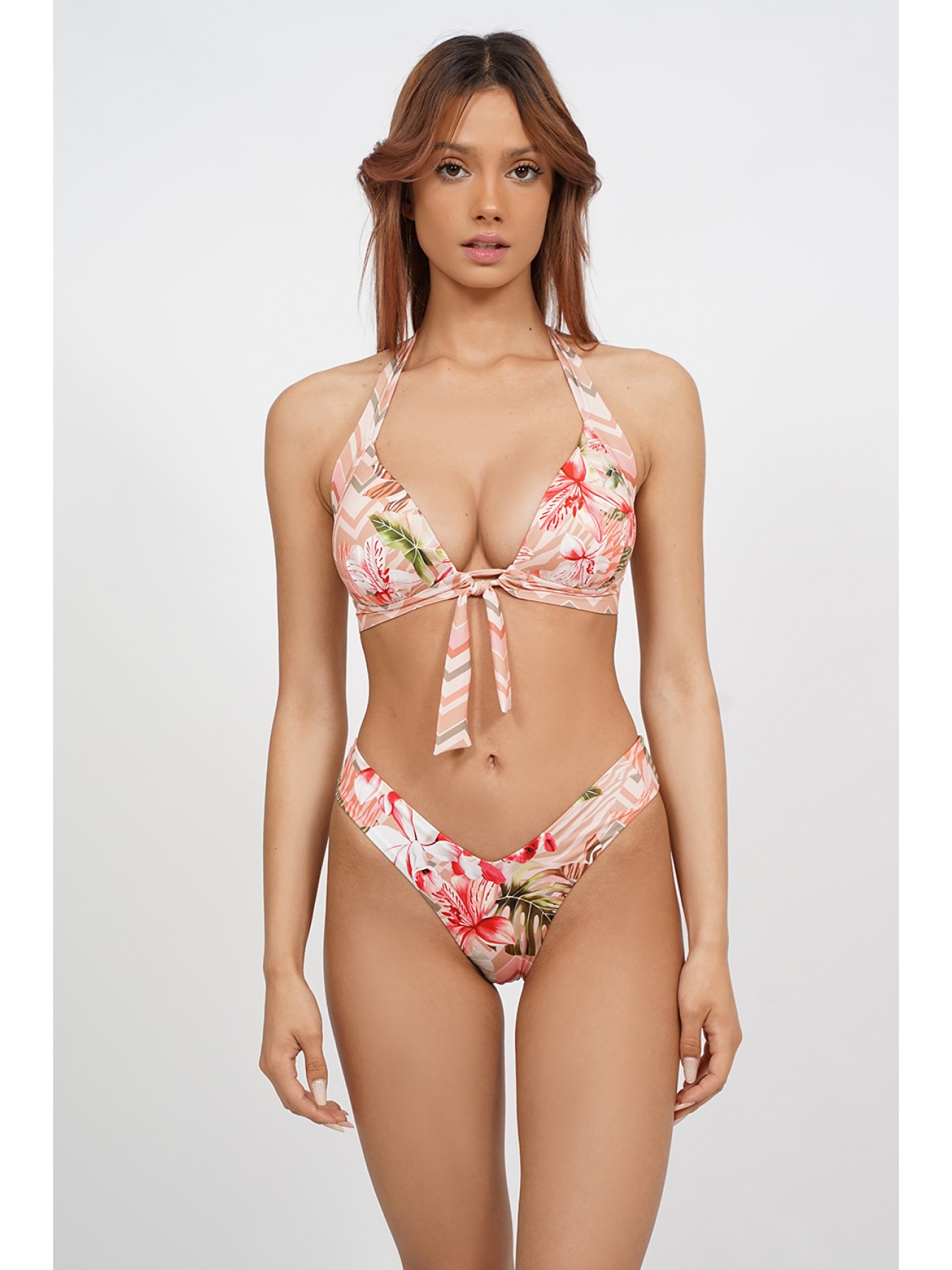 Раздельный купальник из коллекции Tropical Fever c ярким принтом. Бюстгальтер-треугольник с формованными чашками. Плавки-галочки.