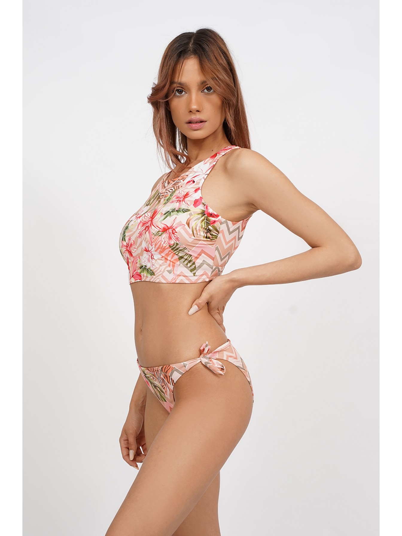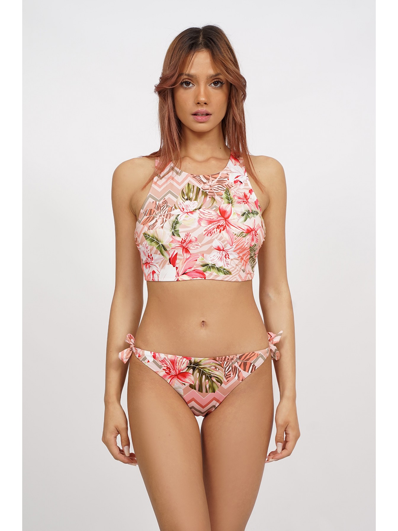 Раздельный купальник из коллекции Tropical Fever c ярким принтом. Топ со съемными вкладышами. На спинке удобная застежка и фигурный вырез. Плавки-слипы на завязках.