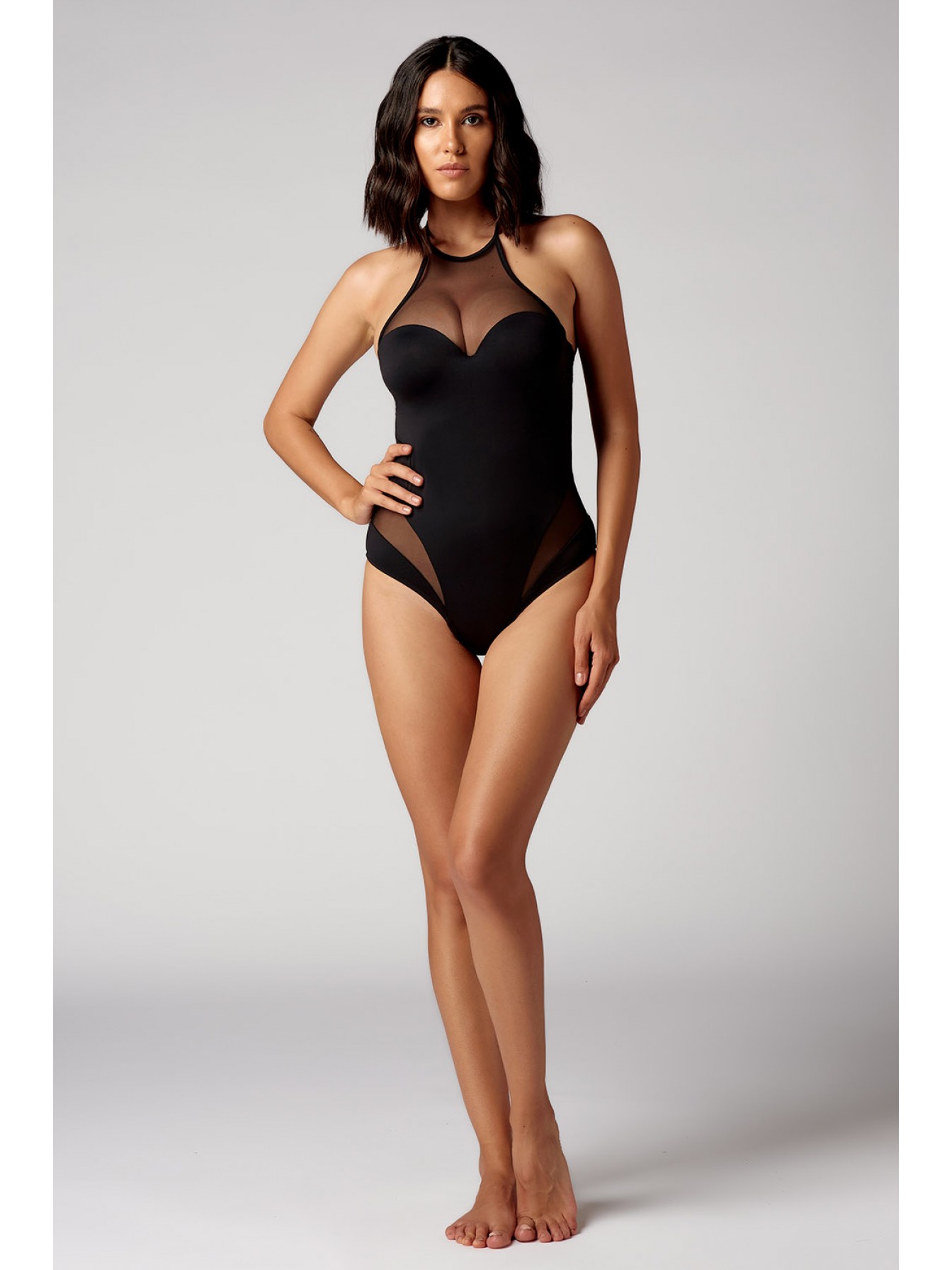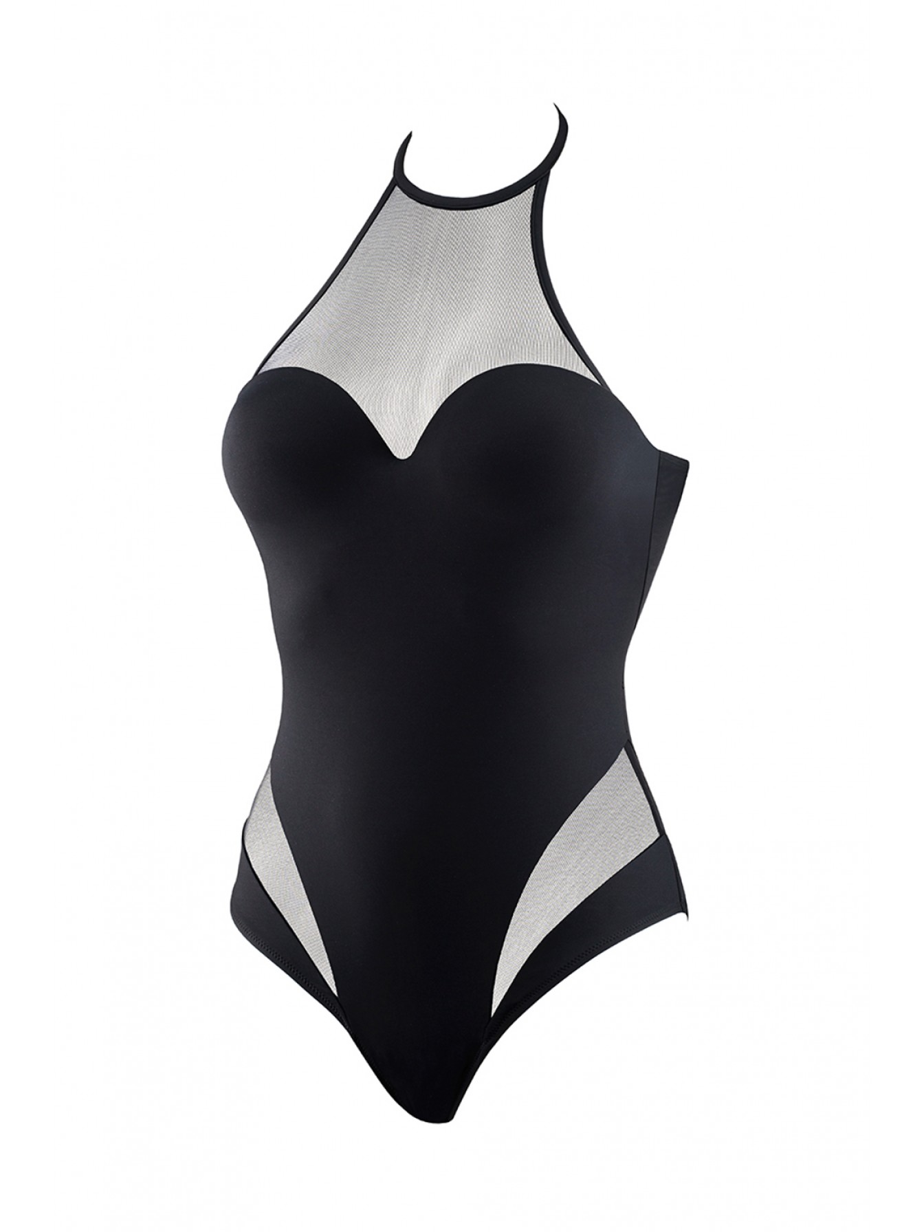 Черный cлитный купальник-балконет из коллекции Dark Seduction с формованными чашками пуш-ап на косточках, декорирован вставками из сеточки. Лиф с формованной чашкой, на спинке застежка.