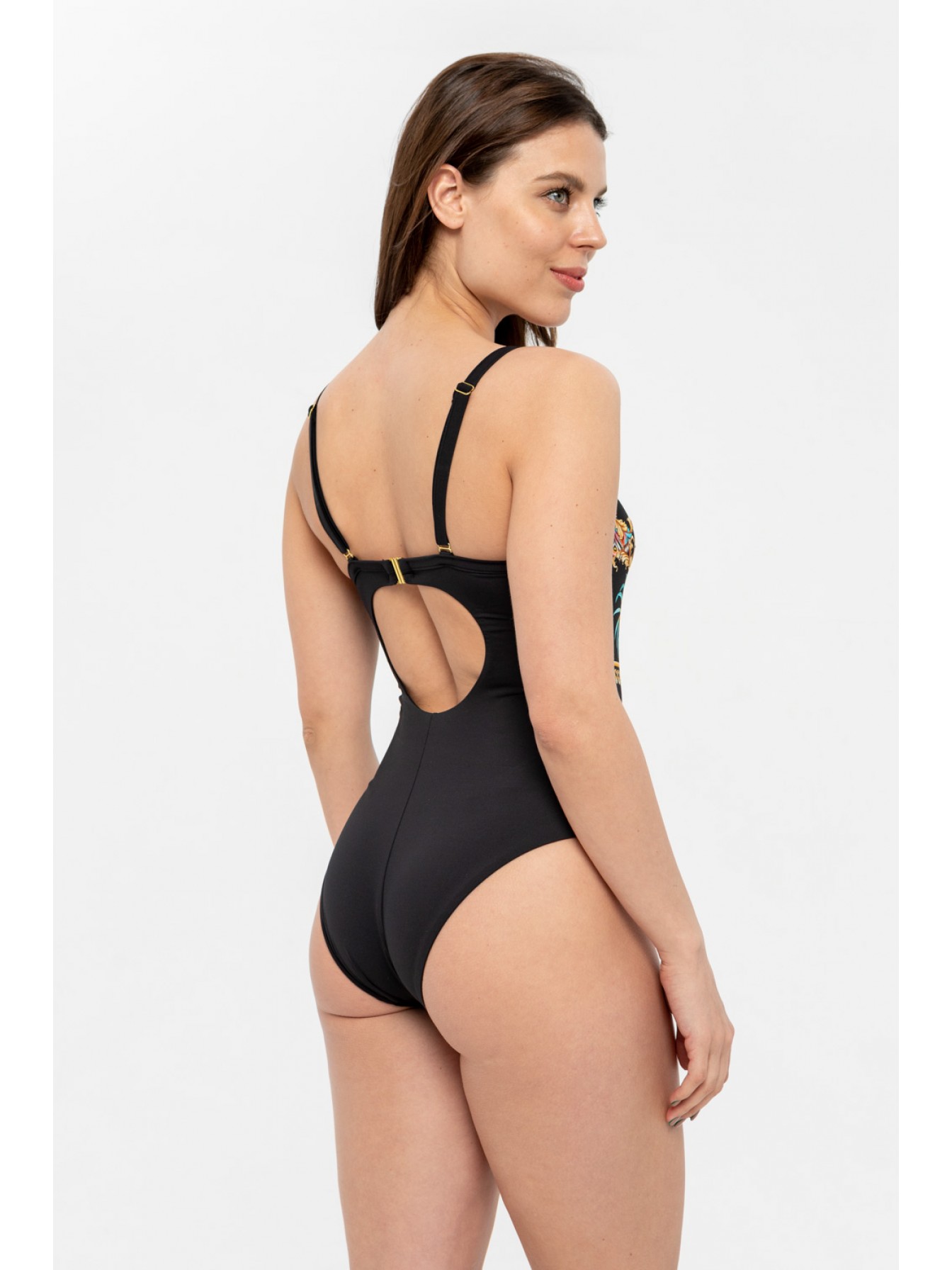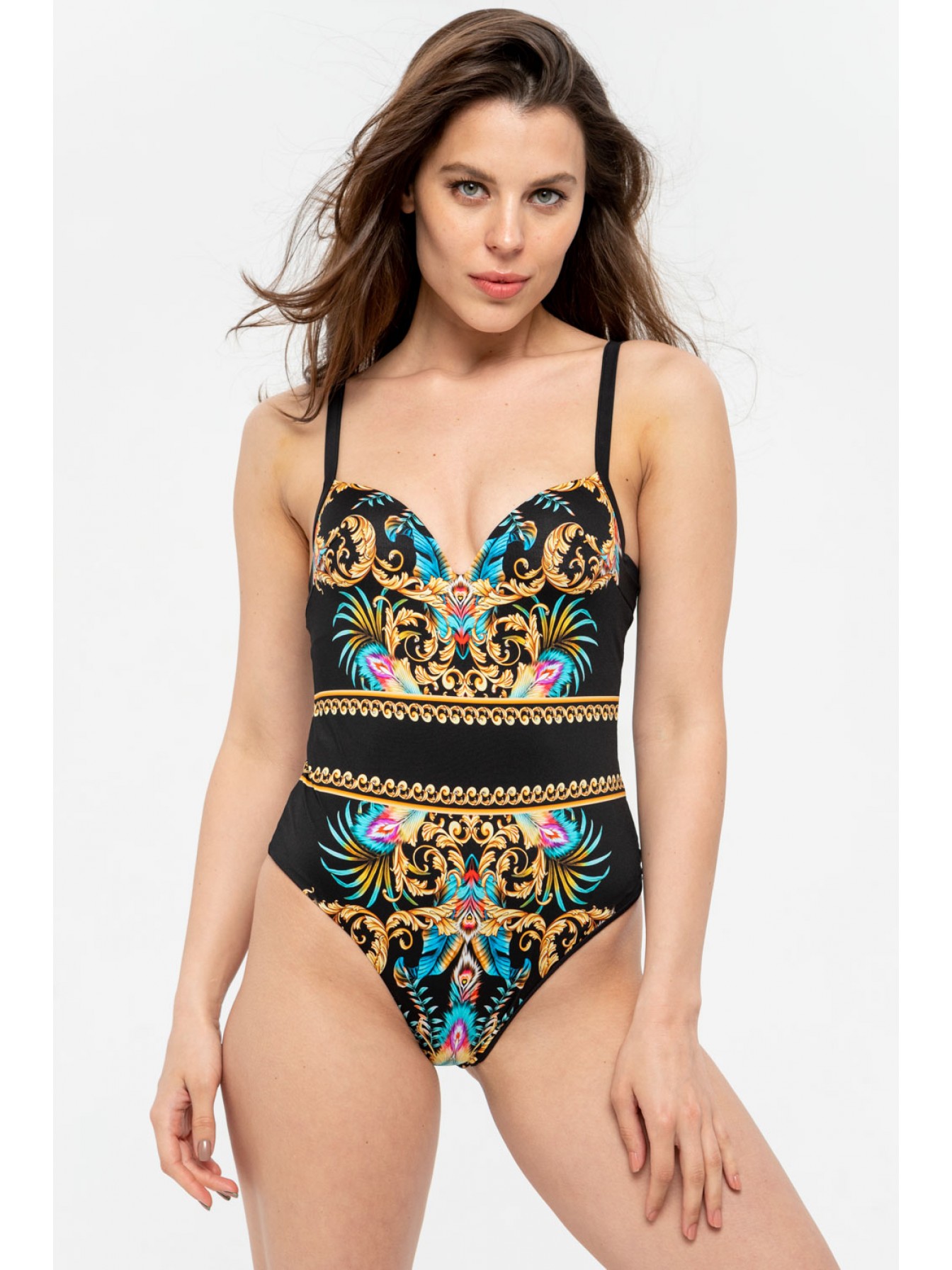 Слитный купальник-балконет из коллекции Cruise Party оформлен оригинальным принтом и кристаллами. Лиф с чашками пуш-ап с гелевым наполнителем на косточках. Бретели регулируются по длине, на спинке застежка и фигурный вырез. Классический вырез бедра.