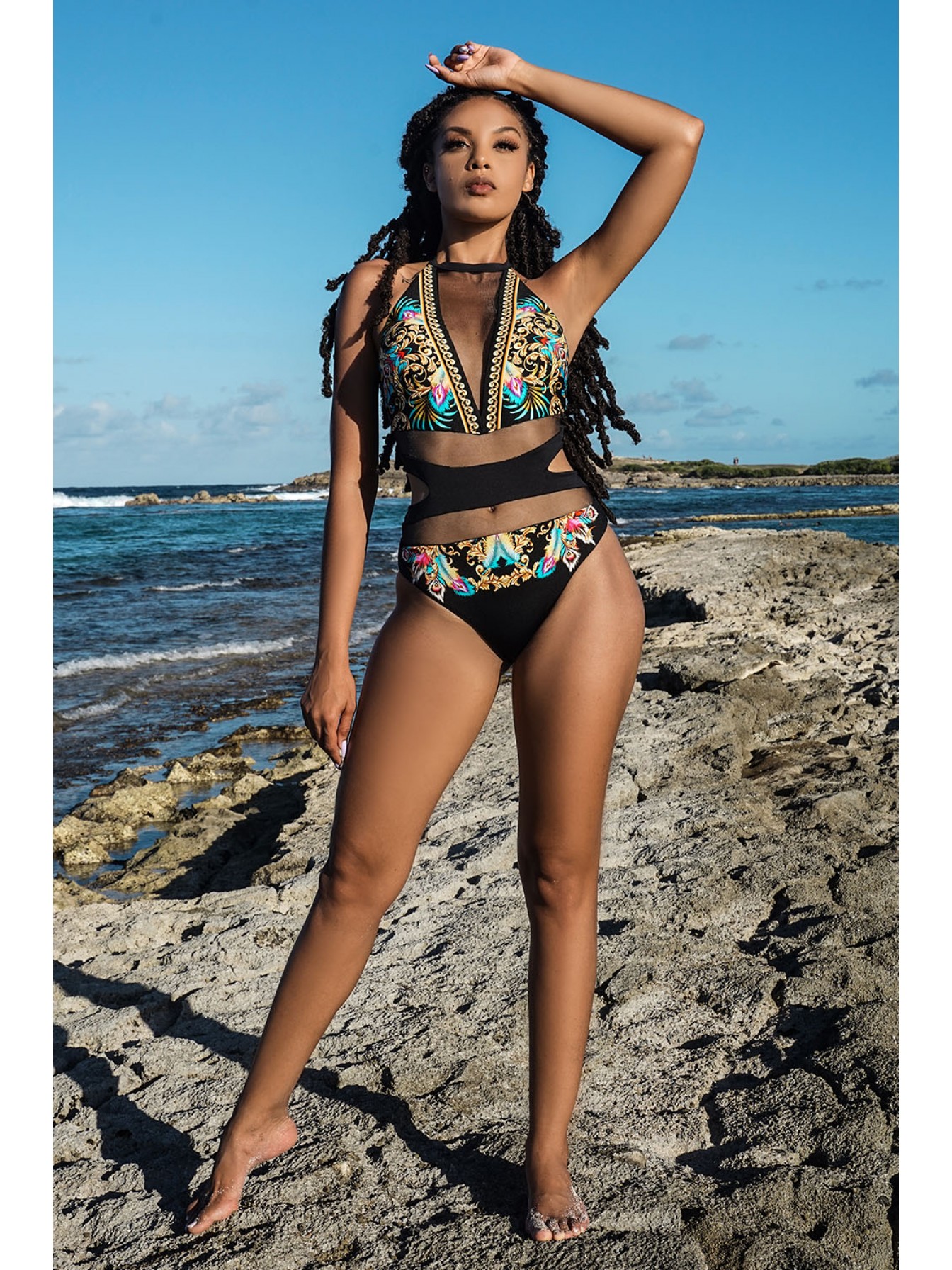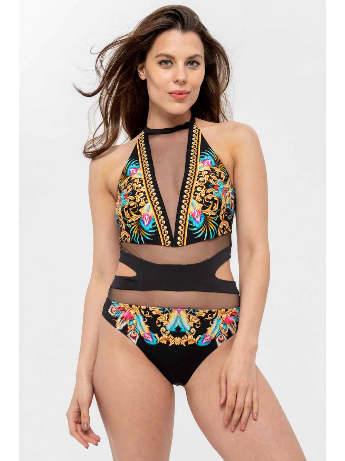 Слитный купальник с верхом-халтер из коллекции Cruise Party оформлен оригинальным принтом, вставками из сетки и кристаллами. Модель со съемными вкладышами. Классический вырез бедра. Спинка открытая.